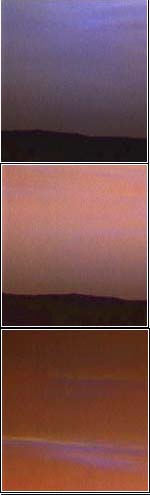 Pathfinder image scientists continue to produce beautiful sunset pictures using color filters to bring out faint dust and water vapor clouds. The high resolution super panorama is now in final processing and will be available for movie makers the world over later today.