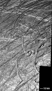 by Bruce Moomaw Cameron Park - April 17, 2000 - Sixteen years ago they predicted that if Europa's outer ice shell is sitting on a layer of slush or liquid -- rather than being directly attached to Europa's main rock body -- Jupiter's tidal tuggings on that shell would very slightly accelerate the rate at which the outer shell rotated relative to Europa's main body, so that it would very slowly slide around the rest of the moon, gliding on the soft middle layer. The resultant very slow changes in the direction of the tidal stresses on the ice shell -- and the fact that the shell would also have to "stretch" over the two small tidal bulges in Europa's rocky main body -- would produce a pattern of cracks in it that closely matched the pattern seen in the surface ice on the anti-Jupiter side of the moon. Hoppa and Greenberg said that Europa's already-known surface marks matched that pattern perfectly, and predicted that Europa's Jupiter-facing side would show a similar pattern of marks. Now Galileo's first good photos of that side have matched their predictions beautifully. It should be emphasized that this additional "non-synchronous rotation" of Europa's outer surface (if it exists) is extremely slow. Comparison of Galileo's photos with the photos of Europa taken 20 years earlier by the Voyager spacecraft show no detectable difference, proving that Europa's surface must slide around its main rock body once every 12,000 years if not much longer. But this is hardly surprising, since Hoppa and Greenberg's calculations had predicted that such a complete slew occurs only every 10 million years or so. As it is, the confirmation of their predictions provides still another piece of very suggestive evidence for the existence of a subsurface Europan ocean either of very soft subsurface ice, ice-water slush, or flat-out liquid water. As P.H. Figeredo reported, "the lineaments [seen on Europa's surface] show that [Europa's ice surface] completed [at least] a full rotation relative to the tidally deformed interior." But how thick is the overlying solid-ice shell? Much of the evidence seen by Galileo suggests that it's very thin: only a few kilometers thick, and perhaps even less than one kilometer in some areas. One of the strongest pieces of evidence for this has been the widely publicized "chaotic terrain": big areas in which Europa's original ice crust seems to have shattered, and the pieces ("icebergs") have then become jaggedly mounted in a new layer of refreezing liquid. The obvious implication is that these are areas where the outer ice has melted through until an underlying ocean of water or slush gushed to the surface. P.J. Thomas stated: "If the chaos regions are the remnants of catastrophic melt-through events, reasonable estimates for basal and shell heating predict that the ice crust will be only a few km thick for 10% of [Europa's] observed surface age" -- and that, based on his calculations, "We anticipate that a more realistic model... should make the ice thinner still."