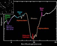 An instrument aboard NASA's recently launched orbiting infrared observatory has found evidence of organic molecules in an enormously powerful galaxy some 3.25 billion light years from the Earth. So powerful is the source, that it is equal to 10 trillion times the luminosity of the sun, making it one of the brightest galaxies ever detected. The instrument on the newly named Spitzer Space Telescope (previously called the Space Infrared Telescope Facility, or SIRTF) is the infrared spectrograph, or IRS. James Houck, professor of astronomy at Cornell University, heads the scientific team on the $39 million IRS contract with the Jet Propulsion Laboratory, Pasadena, Calif., a division of the California Institute of Technology, manager of the mission for NASA. Houck participated in a press conference at NASA headquarters in Washington, D.C., today (Dec. 18) at which the first observations and data from the half-billion-dollar observatory, launched Aug. 25, were released. Among the most spectacular details released were dazzling images taken with the space telescope's infrared-array camera and with its multiband-imaging photometer. The images include a glowing stellar nursery; a swirling, dusty galaxy; a disc of planet-forming debris; and organic material in the distant universe. The IRS, one of three instruments carried by the space telescope, is the most sensitive infrared spectrograph ever to go into space. In less than 15 minutes it produced a spectrum of the distant galaxy IRAS 00183, first observed by the infrared astronomical satellite (IRAS) in 1983. The spectrum "gives evidence for organic chemistry in a distant galaxy shortly after the formation of the Earth," says Houck. (While the Spitzer observatory's cameras take infrared snapshots of distant galaxies and dust clouds, and objects too cool to emit visible light, the IRS determines their precise infrared colors. Astronomers are then able to read the peaks and valleys in the spectrum, called emission and absorption lines, to determine the chemical mix of the object being observed.) In an optical image, the IRAS galaxy appears as no more than a faint smudge. But the IRS spectrum - the first detailed look at the galaxy - shows a broad silicate feature. The dominant absorber of visible energy is tiny silicate dust particles. The silicate dust is so opaque that only a small percentage of the visible light escapes the galaxy, says Houck. "We are seeing the merger of two galaxies. This produces one of two effects: Either what we are seeing is a brief flash of incredibly strong star formation, or one or both of the galaxies contained a black hole before colliding. The massive black holes are releasing the energy by swallowing stars and gas," says Houck. In both cases, he says, the collision would compress gas that would trigger the star formation or the release of energy from the black hole, a process called "feeding the monster." Both scenarios have problems, Houck concedes. "One is, how do you get enough gas close enough to a black hole to make all this happen? And how do you get stars to form so quickly all at the same time?" Houck's IRS team also released a spectrum of HH46IR, a "dusty, dirty cloud" in our galaxy, the Milky Way, that visible light is unable to penetrate. The spectrum shows the cloud to be a region of star formation containing organic materials, including methyl alcohol, carbon dioxide ice and carbon monoxide gas and ice. Houck also notes that the IRS is "working well" and is likely to be "a workhorse for years to come." During November, he relates, the instrument was subject to a massive proton "storm" in space, with 1.6 billion atomic particles (mostly protons) bombarding a square centimeter of the instrument in just two days. "It was a staggering event," he says. Related Links Spitzer Space Telescope at JPL SpaceDaily Search SpaceDaily Subscribe To SpaceDaily Express