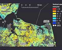 Anew NASA-led study shows that land in the Hampton Roads, Virginia, metropolitan area is sinking at highly uneven rates, with a few trouble spots subsiding 7 to 10 times faster than the area average. Whereas earlier estimates had suggested the area is subsiding evenly, the new study found that major differences in subsidence rates occur only a few miles apart.