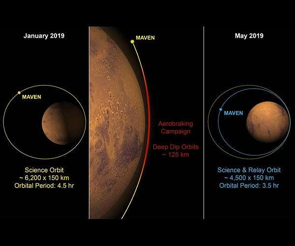 NASA's MAVEN spacecraft shrinking its Mars orbit to prepare for Mars 2020 Rover![]() Greenbelt MD (SPX) Feb 12, 2019 NASA's 4-year-old atmosphere-sniffing Mars Atmosphere and Volatile Evolution (MAVEN) mission is embarking on a new campaign to tighten its orbit around Mars. The operation will reduce the highest point of the MAVEN spacecraft's elliptical orbit from 3,850 to 2,800 miles (6,200 to 4,500 kilometers) above the surface and prepare it to take on additional responsibility as a data-relay satellite for NASA's Mars 2020 rover, which launches next year. "The MAVEN spacecraft has done a phenomenal job teach ... read more |