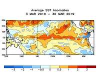 NASA Sees El Nino Conditions Prevail in the Central Pacific Ocean Greenbelt MD (SPX) Apr 12, 2019 An El Nino that began to form last fall has matured and is now fully entrenched across the Pacific Ocean. Changes in sea surface temperatures (SSTs) brought about by an El Nino affect the atmosphere, resulting in distinctive changes in the rainfall pattern across the Pacific Basin. These changes show up as anomalies or deviations in NASA's analysis of climatological rainfall.