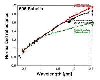 When asteroid 596 Scheila collided with an object in the asteroid belt between Mars and Jupiter in December 2010, a fresh layer of material was exposed on the asteroid surface . An international research team observed the spectrum from the asteroid approximately ten years later, to see how space weathering affects the surface over a genuine timescale. Within the uncertainty of the observations, ... more |