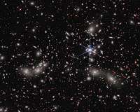Astronomers have revealed the latest deep field image from NASA's James Webb Space Telescope, featuring never-before-seen details in a region of space known as Pandora's Cluster (Abell 2744). Webb's view displays three clusters of galaxies - already massive - coming together to form a megacluster. The combined mass of the galaxy clusters creates a powerful gravitational lens, a natural magnifica ... more |