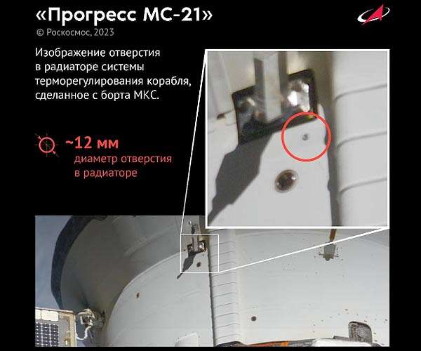 Russia claims Progress leak caused by an "external impact" Space Coast FL (SPX) Feb 22, 2023 Roscosmos on Tuesday blamed an "external impact," not a manufacturing defect, for a coolant leak from an unmanned Russian supply ship docked at the International Space Station on February 11.