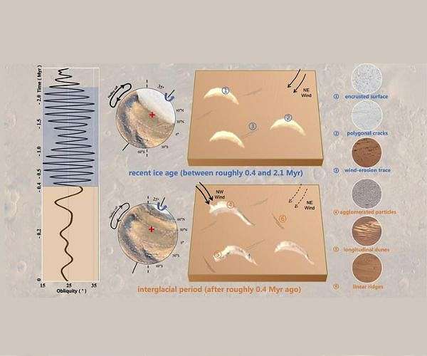 ![]() Martian dunes eroded by a shift in prevailing winds after the planet's last ice age