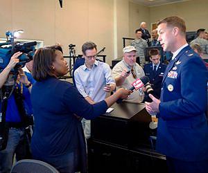 Col. Eric Krystkowiak, 45th Launch Group commander, conducts an interview with Melonie Holt of channel 9, following the Multi Vehicle Launch Support Center grand opening ceremony March 4, 2015, at the 45th Space Wing's Headquarters building at Cape Canaveral Air Force Station, Fla. The renovated center is now equipped with 30 computers, 60 monitors, six projection screens and countdown clocks to provide video and data during launch countdowns. Image courtesy USAF/Matthew Jurgens. For a larger version of this image please go here.