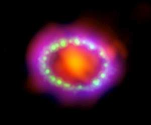 Striking new observations with the Atacama Large Millimeter/submillimeter Array (ALMA) telescope capture, for the first time, the remains of a recent supernova brimming with freshly formed dust. If enough of this dust makes the perilous transition into interstellar space, it could explain how many galaxies acquired their dusty, dusky appearance. Galaxies can be remarkably dusty places [1] and supernovae are thought to be a primary source of that dust, especially in the early Universe. But direct evidence of a supernova's dust-making capabilities has been slim up to now, and could not account for the copious amount of dust detected in young, distant galaxies. But now observations with ALMA are changing that. "We have found a remarkably large dust mass concentrated in the central part of the ejecta from a relatively young and nearby supernova," said Remy Indebetouw, an astronomer at the National Radio Astronomy Observatory (NRAO) and the University of Virginia, both in Charlottesville, USA. "This is the first time we've been able to really image where the dust has formed, which is important in understanding the evolution of galaxies." An international team of astronomers used ALMA to observe the glowing remains of Supernova 1987A [2], which is in the Large Magellanic Cloud, a dwarf galaxy orbiting the Milky Way about 160 000 light-years from Earth. SN 1987A is the closest observed supernova explosion since Johannes Kepler's observation of a supernova inside the Milky Way in 1604. Astronomers predicted that as the gas cooled after the explosion, large amounts of dust would form as atoms of oxygen, carbon, and silicon bonded together in the cold central regions of the remnant. However, earlier observations of SN 1987A with infrared telescopes, made during the first 500 days after the explosion, detected only a small amount of hot dust. With ALMA's unprecedented resolution and sensitivity, the research team was able to image the far more abundant cold dust, which glows brightly in millimetre and submillimetre light. The astronomers estimate that the remnant now contains about 25 percent the mass of the Sun in newly formed dust. They also found that significant amounts of carbon monoxide and silicon monoxide have formed. "SN 1987A is a special place since it hasn't mixed with the surrounding environment, so what we see there was made there," said Indebetouw. "The new ALMA results, which are the first of their kind, reveal a supernova remnant chock full of material that simply did not exist a few decades ago." Supernovae, however, can both create and destroy dust grains. As the shockwave from the initial explosion radiated out into space, it produced bright glowing rings of material, as seen in earlier observations with the NASA/ESA Hubble Space Telescope. After hitting this envelope of gas, which was sloughed off by the progenitor red giant star as it neared the end of its life, a portion of this powerful explosion rebounded back towards the centre of the remnant. "At some point, this rebound shockwave will slam into these billowing clumps of freshly minted dust," said Indebetouw. "It's likely that some fraction of the dust will be blasted apart at that point. It's hard to predict exactly how much - maybe only a little, possibly a half or two thirds." If a good fraction survives and makes it into interstellar space, it could account for the copious dust astronomers detect in the early Universe. "Really early galaxies are incredibly dusty and this dust plays a major role in the evolution of galaxies," said Mikako Matsuura of University College London, UK. "Today we know dust can be created in several ways, but in the early Universe most of it must have come from supernovae. We finally have direct evidence to support that theory." Notes: [1] Cosmic dust consist of silicate and graphite grains - minerals also abundant on Earth. The soot from a candle is very similar to cosmic graphite dust, although the size of the grains in the soot are ten or more times bigger than typical grain sizes of cosmic graphite grains. [2] Light from this supernova arrived at Earth in 1987, as is reflected in the name.