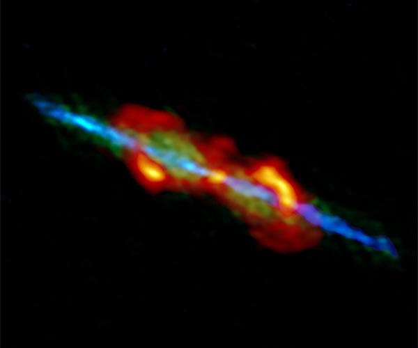 An international team of astronomers using the Atacama Large Millimeter/submillimeter Array (ALMA) has captured the very moment when an old star first starts to alter its environment. The star has ejected high-speed bipolar gas jets which are now colliding with the surrounding material; the age of the observed jet is estimated to be less than 60 years. These features help scientists understand how the complex shapes of planetary nebulae are formed. Sun-like stars evolve to puffed-up Red Giants in the final stage of their lives. Then, the star expels gas to form a remnant called a planetary nebula. There is a wide variety in the shapes of planetary nebulae; some are spherical, but others are bipolar or show complicated structures. Astronomers are interested in the origins of this variety, but the thick dust and gas expelled by an old star obscure the system and make it difficult to investigate the inner-workings of the process. To tackle this problem, a team of astronomers led by Daniel Tafoya at Chalmers University of Technology, Sweden, pointed ALMA at W43A, an old star system around 7000 light years from Earth in the constellation Aquila, the Eagle. Thanks to ALMA's high resolution, the team obtained a very detailed view of the space around W43A. "The most notable structures are its small bipolar jets," says Tafoya, the lead author of the research paper published by the Astrophysical Journal Letters. The team found that the velocity of the jets is as high as 175 km per second, which is much higher than previous estimations. Based on this speed and the size of the jets, the team calculated the age of the jets to be less than a human life-span. "Considering the youth of the jets compared to the overall lifetime of a star, it is safe to say we are witnessing the 'exact moment' that the jets have just started to push through the surrounding gas," explains Tafoya. "The jets carve through the surrounding material in as little as 60 years. A person could watch their progress throughout their lifetime." In fact, the ALMA image clearly maps the distribution of dusty clouds entrained by the jets, which is telltale evidence that it is impacting on the surroundings. The team suggests how this entrainment could be the key to formimg a bipolar-shaped planetary nebula. In their scenario, the aged star originally ejects gas spherically and the core of the star loses its envelope. If the star has a companion, gas from the companion pours onto the core of the dying star, and a portion of this new gas forms the jets. Therefore, whether or not the old star has a companion is an important factor to determine the structure of the resulting planetary nebula. "W43A is one of the peculiar so called 'water fountain' objects," says Hiroshi Imai at Kagoshima University, Japan, a member of the team. "These are old stars which show characteristic radio emission from water molecules. Our ALMA observations lead us to think that the water heated to generate the radio emission is located the interface region between the jets and the surrounding material. Perhaps all these 'water fountain' sources consist of a central binary system which has just launched a new, double jet, just like W43A." The team are already working on new ALMA observations of other, similar stars. They are hoping to gain new insight into how planetary nebulae form, and what lies in the future for stars like the Sun. "There are only 15 'water fountain' objects identified to date, despite the fact that more than 100 billion stars are included in our Milky Way Galaxy," explains Jose Francisco Gomez at Instituto de Astrofisica de Andalucia, Spain. "This is probably because the lifetime of the jets is quite short, so we are very lucky to see such rare objects."