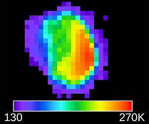 NASA's longest-lived mission to Mars has gained its first look at the Martian moon Phobos, pursuing a deeper understanding by examining it in infrared wavelengths. The Thermal Emission Imaging System (THEMIS) camera on NASA's Mars Odyssey orbiter observed Phobos on Sept. 29, 2017. THEMIS Principal Investigator Philip Christensen and THEMIS Mission Planner, Jonathon Hill of ASU's School of Earth and Space Exploration, combined visible-wavelength and infrared data to produce an image color-coded for surface temperatures of this moon, which has been considered for a potential future human-mission outpost. "Although THEMIS has been at Mars for 16 years, this was the first time we have been able to turn the spacecraft around to look at Phobos," said Hill. "This half-moon view of Phobos was chosen because it allowed us to observe a wide range of temperatures on the surface." Looking across the image from left to right presents a sequence of times of day on the Martian moon, from before dawn, to sunrise, to increasing amounts of time after dawn. This provides information about how quickly the ground warms, which is related to the texture of the surface. As barefoot beach walks can confirm, sand warms or cools quicker than rocks or pavement. "Including a predawn area in the observation is useful because all the heating from the previous day's sunshine has reached its minimum there," said THEMIS Deputy Principal Investigator Victoria Hamilton of Southwest Research Institute. "As you go from predawn area to morning area you get to watch the heating behavior. If it heats up very quickly, it's likely not very rocky but dusty instead." Phobos has an oblong shape with an average diameter of about 14 miles (22 kilometers). Cameras on other Mars orbiters have previously taken higher-resolution images of Phobos, but none with the infrared information available from THEMIS. Observations in multiple bands of thermal-infrared wavelengths can yield information about the mineral composition of the surface, as well as the surface texture. One major question about Phobos and Mars' even smaller moon, Deimos, is whether they are captured asteroids or bits of Mars knocked into the sky by impacts. Compositional information from THEMIS might help pin down their origin. Since Odyssey began orbiting the Red Planet in 2001, THEMIS has provided compositional and thermal-properties information from all over Mars, but never before imaged either Martian moon. The Sept. 29 observation was completed to validate that the spacecraft could safely do so, as the start of a possible series of observations of Phobos and Deimos in coming months. In normal operating mode, Odyssey keeps the THEMIS camera pointed straight down as the spacecraft orbits Mars. In 2014, the spacecraft team at Lockheed Martin Space Systems, Denver; and NASA's Jet Propulsion Laboratory, Pasadena, California; and the THEMIS team at ASU, developed procedures to rotate the spacecraft for upward-looking imaging of Comet Siding Spring as it passed near Mars. The teams have adapted those procedures for imaging the Martian moons. "We now have the capability of rotating the spacecraft for THEMIS observations," said Odyssey Project Scientist Jeffrey Plaut of JPL. "There is heightened interest in Phobos because of the possibility that future astronauts could perhaps use it as an outpost." With the first observation now in hand, plans are advancing for additional opportunities at different illumination phases of Phobos and Deimos. "THEMIS has probably been the most interesting mission I've been a part of," says Christensen. "We've learned a great deal about Mars, and it is very exciting to still be doing new and unique science 16 years after we got there."
