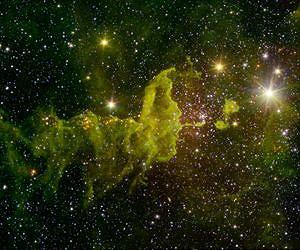 A nebula known as "the Spider" glows fluorescent green in an infrared image from NASA's Spitzer Space Telescope and the Two Micron All Sky Survey (2MASS). The Spider, officially named IC 417, lies near a much smaller object called NGC 1931, not pictured in the image. Together, the two are called "The Spider and the Fly" nebulae. Nebulae are clouds of interstellar gas and dust where stars can form. The Spider, located about 10,000 light-years from Earth in the constellation Auriga, is clearly a site of star formation. It resides in the outer part of the Milky Way, almost exactly in the opposite direction from the galactic center. A group of students, teachers and scientists focused their attention on this region as part of the NASA/IPAC Teacher Archive Research Program (NITARP) in 2015. They worked on identifying new stars in this area. One of the largest clusters of young stars in the Spider can be seen easily in the image. Toward the right of center, against the black background of space, you can see a bright group of stars called "Stock 8." The light from this cluster carves out a bowl in the nearby dust clouds, seen in the imageas green fluff. Along the sinuous tail in the center, and to the left, the groupings of red point sources clumped in the green are also young stars. In the image, infrared wavelengths, which are invisible to the unaided eye, have been assigned visible colors. Light with a wavelength of 1.2 microns, detected by 2MASS, is shown in blue. The Spitzer wavelengths of 3.6 and 4.5 microns are green and red, respectively. Spitzer data used to create the image were obtained during the space telescope's "warm mission" phase, following its depletion of coolant in mid-2009. Due to its design, Spitzer remains cold enough to operate efficiently at two channels of infrared light. It is now in its 12th year of operation since launch. The 2MASS mission was a joint effort between the California Institute of Technology, Pasadena; the University of Massachusetts, Amherst; and NASA's Jet Propulsion Laboratory, Pasadena, California.