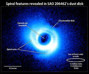 For more than four hundred years, astronomers have used telescopes to study the great variety of stars in our galaxy. Millions of distant suns have been catalogued. There are dwarf stars, giant stars, dead stars, exploding stars, binary stars; by now, you might suppose that every kind of star in the Milky Way had been seen. That's why a recent discovery is so surprising. Researchers using the Subaru telescope in Hawaii have found a star with spiral arms. The name of the star is SAO 206462. It's a young star more than four hundred light years from Earth in the constellation Lupus, the wolf. SAO 206462 attracted attention because it has a circumstellar disk--that is, a broad disk of dust and gas surrounding the star. Researchers strongly suspected that new planets might be coalescing inside the disk, which is about twice as wide as the orbit of Pluto. When they took a closer look at SAO 206462 they found not planets, but arms. Astronomers have seen spiral arms before: they're commonly found in pinwheel galaxies where hundreds of millions of stars spiral together around a common core. Finding a clear case of spiral arms around an individual star, however, is unprecedented1. The arms might be a sign that planets are forming within the disk. "Detailed computer simulations have shown us that the gravitational pull of a planet inside a circumstellar disk can perturb gas and dust, creating spiral arms," says Carol Grady, an astronomer with Eureka Scientific, Inc., who is based at NASA's Goddard Space Flight Center. "Now, for the first time, we're seeing these dynamical features." Grady revealed the image to colleagues on Oct. 19th at a meeting at Goddard entitled Signposts of Planets. Theoretical models show that a single embedded planet may produce a spiral arm on each side of a disk. The structures around SAO 206462, however, do not form a matched pair, suggesting the presence of two unseen worlds, one for each arm. Grady's research is part of a five-year international study of newborn stars and planets using the giant 8.2 meter Subaru Telescope. Operated by the National Astronomical Observatory of Japan, Subaru scans the heavens from a perch almost 14,000 feet above sea level at the summit of the Hawaiian volcano Mauna Kea. From there it has a crystal-clear view of innumerable young stars and their planet-forming disks throughout the Milky Way. "What we're finding is that once these systems reach ages of a few million years-that's young for a star--their disks begin to show all kinds of interesting shapes," says John Wisniewski, a collaborator at the University of Washington in Seattle. "We've seen rings, divots, gaps--and now spiral features. Many of these structures could be caused by planets moving within the disks." However, it is not an open and shut case. The research team cautions that processes unrelated to planets might give rise to these structures. Until more evidence is collected--or until the planets themselves are detected--they can't be certain. Whatever the cause of the arms, their reality is undeniable and the great catalogue of stars has one more type. Stay tuned to science@nasa for future entries.