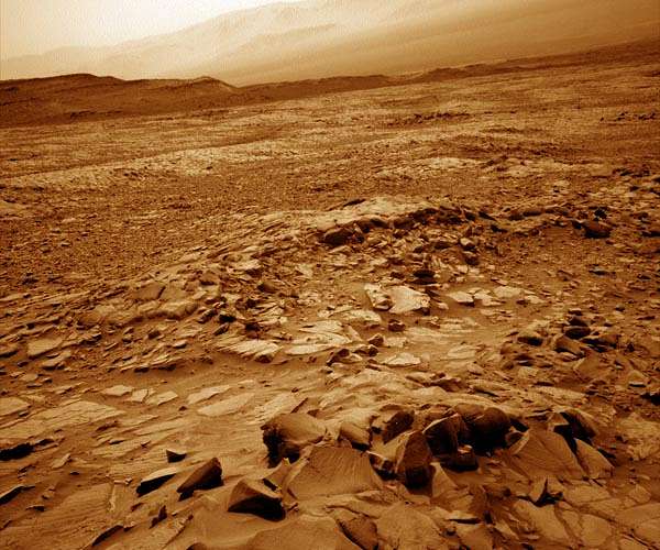 Our Monday drive was successful, and we are now fully surrounded by the rocks that cap the Greenheugh pediment. From here we can see hundreds of ventifacts - a term that describes rocks which have been abraded by wind-blown sand into distinctive, flattened facets with crisp edges. This terrain is very different from what we've become used to seeing during our climb up Mt. Sharp! Today's plan is all about exploring the local area. We will collect APXS and MAHLI observations of a relatively large, less dusty ventifact near the rover's wheel at a target named "Knott." Elsewhere on that same rock, we will also collect a ChemCam LIBS observation of a target with neat sedimentary structures named "Old Nab," as well as a ChemCam RMI observation of another area of the rock named "Little Mell." This rock is visible in the upper left in the above Navcam image. We'll also collect several Mastcam mosaics of targets near and far, as well as a standard set of observations to monitor our environment. The first day of the plan concludes with a drive to the southwest, towards a very small crater that might give us an interesting glimpse into the sedimentary structures in the area. At our perch on the top of the pediment, we have a spectacular view of the terrain below. We can see across the plains of Gale crater where we landed all the way to the crater's rim tens of miles in the distance. Slightly closer, we can also see the distinctly layered nature of Gediz Vallis Ridge, which sits on top of the pediment and is one of the youngest geomorphic features on Mt. Sharp (seen to the left in this image). Between the ventifacts and the viewshed, it's quite an imposing place to rest before our next drive.