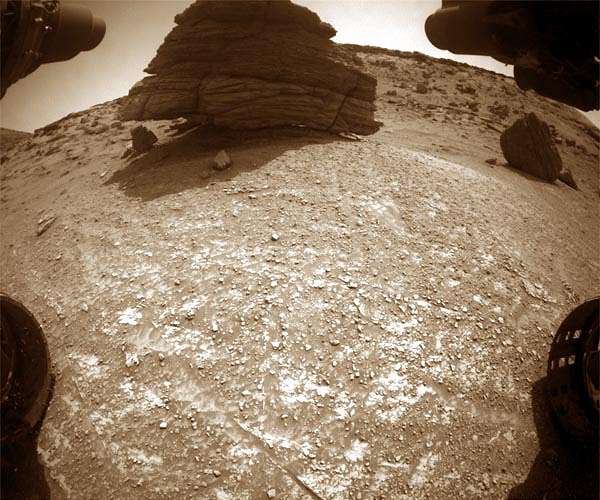 We have been making our way to a large boulder "Ilha Nova Destino" (which from the distance looks remarkably like the Hogwarts Sorting Hat from Harry Potter!) and landed about 3 metres back from the block. Although we would have loved to get closer, the boulder is as large as the rover (as tall as an SUV) and considerably less stable looking, appearing to be almost perched up on one side. To reduce danger to Curiosity, we planned to keep our distance, just getting close enough for ChemCam LIBS. ChemCam will combine LIBS compositional measurements (on targets "Serra Dourada," "Serra Nova Olinda" and "Serra da Lua") and RMI imaging (on targets "Ilha de Maraca" and "Ilha Sao Lourenco") to conduct a very thorough survey of the rock. Mastcam will undertake a multispectral analysis of the boulder, and image "St Marys" along the base of the boulder, looking at the contact with the underlying bedrock. Mastcam will also target a second large float rock "Wineperu," which can be seen to the right of the Ilha Nova Destino boulder in the Front Haz camera image above. As APXS Strategic Planner this week, I was disappointed that we would not get close enough to use APXS to look at the composition of this large boulder. But, almost magically, when we started planning this morning, we discovered a small float block that may have broken off Ilha Nova Destion - you can see this float "Monte Caburai" in the shadow in front of the boulder in the Front Haz camera image. This float block was close enough to allow both APXS and MAHLI to analyze it. Additionally, MAHLI were able to add a "dogs-eye" (a set of overlapping images which are used to make a larger mosaic) along the base of Ilha Nova Destino, looking at the layering. In addition to this, ENV will continue to monitor environmental conditions in Gale, tracking dust level changes in the atmosphere and watching for dust devils on the ground. REMS will record temperatures and DAN continues to look for evidence of hydrogen (hydrogen detection may indicate the presence of water in minerals). We will drive onwards on the third sol of the plan, driving to the right past Wineperu, which will allow us to look back at Ilha Nova Destino and get some images of the back of the boulder.