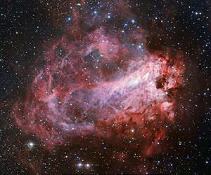 The nebula pictured here may have had more names bestowed upon it over the ages than any other object of its kind. Although officially known as Messier 17, its nicknames include: the Omega Nebula, the Swan Nebula, the Checkmark Nebula, the Horseshoe Nebula and - lest those with more of a more marine bent miss out - the Lobster Nebula. Messier 17 is located about 5500 light-years from Earth near the plane of the Milky Way and in the constellation of Sagittarius (The Archer). The object spans a big section of the sky - its gas and dust clouds measure about 15 light-years across. This material is fueling the birth of new stars and the wide field of view of the new picture reveals many stars in front of, in, or behind Messier 17. The nebula appears as a complex red structure with some graduation to pink. Its colouring is a signature of glowing hydrogen gas. The short-lived blue stars that recently formed in Messier 17 emit enough ultraviolet light to heat up surrounding gas to the extent that it begins to glow brightly. In the central region the colours are lighter, and some parts appear white. This white colour is real - it arises as a result of mixing the light from the hottest gas with the starlight reflected by dust. The gas in the nebula is estimated to have more than 30 000 times the mass of the Sun. Messier 17 also contains an open star cluster of 35 stars, which is known as NGC 6618 [1]. The total number of stars in the nebula, however, is much higher - there are almost 800 stars in the centre with even more forming in its outer regions. Throughout this rosy glow, the nebula shows a web of darker regions of dust that obscure the light. This obscuring material is also glowing and - although these areas are dark in this visible-light image - they look bright when observed using infrared cameras. The nebula owes its official name to the French comet hunter Charles Messier who included the nebula as the seventeenth object in his famous astronomical catalogue in 1764 [2]. But even with a name as bland as Messier 17, this flowery nebula still looks dazzling.