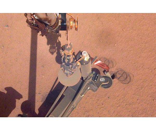 Only five centimetres of the Mars 'Mole' are still protruding above the planet's surface, and it is thought that it could have initially driven itself as much as 35 centimetres into the subsurface. A small crater has formed around the shaft, with the result that the small penetrometer is experiencing insufficient friction against its exterior to be able to move deeper. Initial attempts to fill this 'Mole hole' using the arm of the InSight lander and its shovel have failed due to the strength of the surface crust. Researchers from the German Aerospace Center (Deutsches Zentrum fur Luft- und Raumfahrt; DLR) and NASA's Jet Propulsion Laboratory (JPL) are now making a new attempt. They are planning to press the Mole sideways against the crater wall using the shovel of the robotic arm in order to give it enough traction and friction to burrow deeper into the surface. "At a depth of 35 centimetres, the Mole left the guide springs in its casing and then began to precess due to the lack of soil friction, without advancing any further," explains Tilman Spohn from the DLR Institute of Planetary Research, and Principal Investigator of the Heat Flow and Physical Properties Package (HP3) experiment. "We want to use lateral pressure provided by the robotic arm's scoop to create the friction that has been lacking." The Mole works like a self-hammering nail, so its recoil has to be absorbed using friction. In June 2019, the researchers first removed the support structure for the HP3 experiment, exposing the Mars Mole to view. "It appears that a solid crust composed of approximately 10 centimetres of cohesive sand is overlying very loose sand," says Spohn, who explains this in his mission logbook. In July and August 2019 attempts were made to 'close' the hole around the Mars mole using first the flat blade and then the tip of the scoop on the robotic arm. However, the crust turned out to be too hard. The new strategy, described as 'pinning' by the team, will be executed on Mars over the coming weeks. The Mole will resume its hammering, aided by the lateral pressure of the arm. However, this technique cannot be fully tested out on Earth in advance. JPL in California has set up a working mock-up of the InSight lander in a test field and installed a replica of DLR's HP3 experiment. While this allows the movements of the robotic arm to be practised, the scientists cannot fully replicate the soil without further information about its formation and composition. "All we know about the soil is what we can see in the images InSight sends us," says Spohn. The team of researchers is already considering alternative steps that may have to be taken in future. Another option is to use the scoop to scrape surface material into the hole, rather than trying to compress it. The robotic arm presents a challenge no matter what solution is selected. It was designed to be as light and low in energy consumption as possible, and was only intended to lift the InSight experiments onto the Martian surface. It moves carefully and halts any movement that exceeds certain parameters. This can occur for many reasons, from a joint motor overvoltage to insufficient heating. Unlike the robotic arm on NASA's Curiosity rover, it does not have any force sensors, so it cannot detect how much force it is exerting and cannot perform a pressing motion continuously. "We are asking the arm to punch above its weight," said Ashitey Trebi-Ollennu, the lead arm engineer at JPL. "It cannot press on the Mole the way a person can. This would be easier if it could, but that is just not the arm we have."