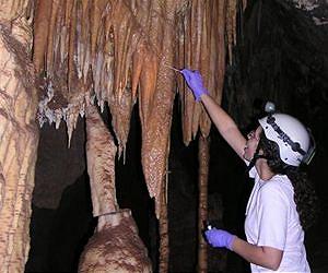 Hidden underneath the hilly grasslands studded with ocotillos and mesquite trees in southeastern Arizona lies a world shrouded in perpetual darkness: Kartchner Caverns, a limestone cave system renowned for its untouched cave formations, sculpted over millennia by groundwater dissolving the bedrock and carving out underground rooms, and passages that attract tourists from all over the world. Beyond the reaches of sunlight and seemingly devoid of life, the caves are in fact teeming with an unexpected diversity of microorganisms that rival microbial communities on the earth's surface, according to a new study led by University of Arizona researchers that has been published in the journal of the International Society for Microbial Ecology. The discovery not only expands our understanding of how microbes manage to colonize every niche on the planet but also could lead to applications ranging from environmental cleanup solutions to drug development. "We discovered all the major players that make up a typical ecosystem," said Julie Neilson, an associate research scientist in the UA's College of Agriculture and Life Sciences. "From producers to consumers, they're all there, just not visible to the naked eye." In a long-standing collaboration between Kartchner Caverns State Park and the UA, Neilson and her co-workers have spent years exploring the underground world and its inhabitants. For their latest study, they swabbed stalactites and other cave formations for DNA analysis. Based on the genes they found in their samples, they reconstructed the bacteria and archaea - single-celled microorganisms that lack a cell nucleus - living in the cave. Kept secret for 14 years after its discovery in 1974 by two UA graduate students who were hiking in the Whetstone Mountains just south of Benson, Ariz., Kartchner Caverns has been protected from human impact so that scientists can study the fragile environment and organisms inside the cave. "We didn't expect to find such a thriving ecosystem feasting on the scraps dripping in from the world above," Neilson said. "What is most interesting is that what we found mirrors the desert above: an extreme environment starved for nutrients, yet flourishing with organisms that have adapted in very unique ways to this type of habitat." Unlike their counterparts on the surface, cave microbes can't harness the energy in sunlight to build organic matter from carbon dioxide in the atmosphere. This process, known as photosynthesis, forms the basis of all life on Earth. In the absence of light, bacteria live off water runoff dripping into the cave through cracks in the overlying rock and harvest the energy locked in compounds leaching out from decaying organic matter in the soils above and minerals dissolved within the rock fissures, Neilson and her team discovered. "Kartchner is unique because it is a cave in a desert ecosystem," Neilson explained. "It's not like the caves in temperate areas such as in Kentucky or West Virginia, where the surface has forests, rivers and soil with thick organic layers, providing abundant organic carbon. Kartchner has about a thousand times less carbon coming in with the drip water." "The cave microbes make a living off the extremely limited nutrients that are available," Neilson said. "Instead of relying on organic carbon, which is a very scarce resource in the cave, they use the energy in nitrogen-containing compounds like ammonia and nitrite to convert carbon dioxide from the air into biomass." The researchers found evidence of cave microbes engaging in all six known pathways that organisms use to fix carbon from the atmosphere to make food and structural material. Neilson said although the nitrogen-driven pathway is probably the most dominant in the cave, there might be others. Some microbes even eat rock - to derive energy from chemical compounds such as manganese or pyrite. Raina Maier, a professor in the Department of Soil, Water and Environmental Science at the College of Agriculture and Life Sciences - the study's principal investigator - said the team expected to find the overall microbial diversity in the cave to be only a fraction of that found in the soil on the surface. "We expected the surface community many times more diverse than the cave," said Maier, who is also a member of the UA's BIO5 Institute. "Instead, we found the cave is about half as diverse as the terrestrial environment where there is sunlight and soil and vegetation. At the same time, the two ecosystems share only 16 percent of the microbial species. In other words, there is a difference of 84 percent between the two, which is amazing." Previous studies had shown that, to the cave microbes, the stalactite they live on is like an island: Restricted to the stalactite they happen to be on, there appears to be little mixing between populations, resulting in different assemblages from one cave formation to another. To analyze the DNA swabbed from the cave formations, Neilson and her team enlisted the help of the lab of Rod Wing, a professor in the UA's Department of Plant Sciences and director of the Arizona Genomics Institute at BIO5. "When you work in extreme starving environments, you barely get enough DNA," Neilson explained. "In some of our samples we got about half of what is considered the minimum amount for DNA sequence analysis. But, we said, let's just try it. And the wonderful technicians in Rod Wing's lab tried all those new techniques and they managed to get us a data set even from the dry rock, where there is no drip water and where there are very few microbes living to begin with." In addition to encountering all the major players that make up a complex food web in the cave, the scientists discovered what likely are microbes yet unknown to science. "Twenty percent of the bacteria whose presence we inferred based on the DNA sequences were not similar enough to anything in the database for us to be able to identify them," Neilson said. "On one stalactite,