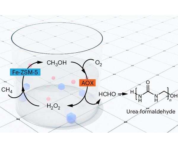 This hybrid catalyst performs a two-step reaction in which zeolite converts methane to methanol, and then the enzyme converts methanol to formaldehyde. That reaction also generates hydrogen peroxide, which is fed back into the zeolite to provide a source of oxygen for the conversion of methane to methanol.