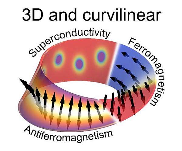 Traditionally, the primary fideld, where curvature is playing a pivotal role, is the theory of general relativity. In recent years, however, the impact of curvilinear geometry enters various disciplines, ranging from solid-state physics over soft-matter physics to chemistry and biology, giving rise to a plethora of emerging domains, such as curvilinear cell biology, semiconductors, superfuidity, optics, plasmonics and 2D van der Waals materials. In modern magnetism, superconductivity and spintronics, extending nanostructures into the third dimension has become a major research avenue because of geometry-, curvature- and topology-induced phenomena. This approach provides a means to improve conventional and to launch novel functionalities by tailoring the curvature and 3D shape. "In recent years, there have appeared experimental and theoretical works dealing with curvilinear and three-dimensional superconducting and (anti-)ferromagnetic nano-architectures. However, these studies originate from different scientific communities, resulting in the lack of knowledge transfer between such fundamental areas of condensed matter physics as magnetism and superconductivity", says Oleksandr Dobrovolskiy, head of the SuperSpin Lab at the University of Vienna. "In our group, we lead projects in both these topical areas and it was the aim of our perspective article to build a "bridge" between the magnetism and superconductivity communities, drawing attention to the conceptual aspects of how extension of structures into the third dimension and curvilinear geometry can modify existing and aid launching novel functionalities upon solid-state systems". "In magnetic materials, the geometrically-broken symmetry provides a new toolbox to tailor curvature-induced anisotropy and chiral responses", says Denys Makarov, head of the department "Intelligent Materials and Systems" at the Helmholtz-Zentrum Dresden-Rossendorf. "The possibility to tune magnetic responses by designing the geometry of a wire or magnetic thin fillm, is one of the main advantages of the curvilinear magnetism, which has a major impact on physics, material science and technology. At present, under its umbrella, the fundamental field of curvilinear magnetism includes curvilinear ferro- and antiferromagnetism, curvilinear magnonics and curvilinear spintronics." "The key difference in the impact of the curvilinear geometry on superconductors in comparison with (anti-)ferromagnets lies in the underlying nature of the order parameter," expands Oleksandr Dobrovolskiy. "Namely, in contrast to magnetic materials, for which energy functionals contain spatial derivatives of vector fields, the description of superconductors also relies on the analysis of energy functionals containing spatial derivatives of scalar fifelds. While in magnetism the order parameter is the magnetization (vector), for a superconducting state the absolute value of the order parameter has a physical meaning of the superconducting energy gap (scalar). In the future, extension of hybrid (anti-)ferromagnet/superconductor structures into the third dimension will enable investigations of the interplay between curvature effects in systems possessing vector and scalar order parameters. Yet, this progress strongly relies on the development of experimental and theoretical methods and the improvement of computation capabilities."