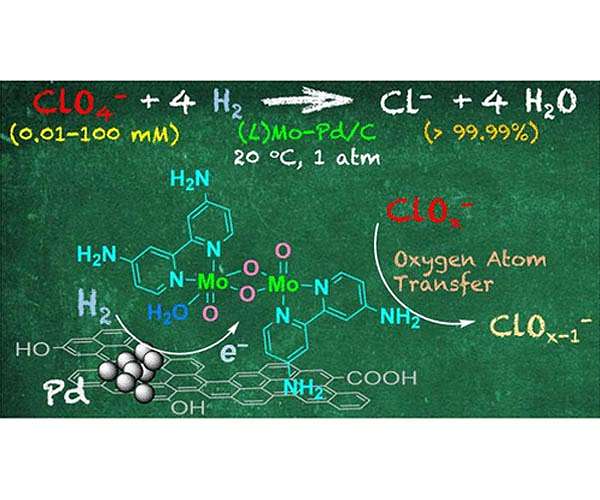 A team led by UC Riverside engineers has developed a catalyst to remove a dangerous chemical from water on Earth that could also make Martian soil safer for agriculture and help produce oxygen for human Mars explorers. Perchlorate, a negative ion consisting of one chlorine atom bonded to four oxygen atoms, occurs naturally in some soils on Earth, and is especially abundant in Martian soil. As a powerful oxidizer, perchlorate is also manufactured and used in solid rocket fuel, fireworks, munitions, airbag initiators for vehicles, matches and signal flares. It is a byproduct in some disinfectants and herbicides. Because of its ubiquity in both soil and industrial goods, perchlorate is a common water contaminant that causes certain thyroid disorders. Perchlorate bioaccumulates in plant tissues and a large amount of perchlorate found in Martian soil could make food grown there unsafe to eat, limiting the potential for human settlements on Mars. Perchlorate in Martian dust could also be hazardous to explorers. Current methods of removing perchlorate from water require either harsh conditions or a multistep enzymatic process to lower the oxidation state of the chlorine element into the harmless chloride ion. Doctoral student Changxu Ren and Jinyong Liu, an assistant professor of chemical and environmental engineering at UC Riverside's Marlan and Rosemary Bourns College of Engineering, took inspiration from nature to reduce perchlorate in water at ambient pressure and temperature in one simple step. Ren and Liu noted anaerobic microbes use molybdenum in their enzymes to reduce perchlorate and harvest energy in oxygen-starved environments. "Previous efforts in constructing a chemical molybdenum catalyst for perchlorate reduction have not been successful," Liu said. "Many other metal catalysts either require harsh conditions or are not compatible with water." The researchers tried to emulate the complicated microbial perchlorate reduction process with a simplified approach. They found by simply mixing a common fertilizer called sodium molybdate, a common organic ligand called bipyridine to bind the molybdenum, and a common hydrogen-activating catalyst called palladium on carbon, they produced a powerful catalyst that quickly and efficiently broke down the perchlorate in water using hydrogen gas at room temperature with no combustion involved. "This catalyst is much more active than any other chemical catalyst reported to date and reduces more than 99.99% of the perchlorate into chloride regardless of the initial perchlorate concentration," Ren said. The new catalyst reduces perchlorate in a wide concentration range, from less than 1 milligram per liter to 10 grams per liter. This makes it suitable for use in various scenarios, including remediating contaminated groundwater, treating heavily contaminated wastewater from explosives manufacturing, and making Mars habitable. "A convenient catalytic reduction system may help harvest oxygen gas from perchlorate washed from the Martian soil when the catalyst is coupled with other processes," Liu said.