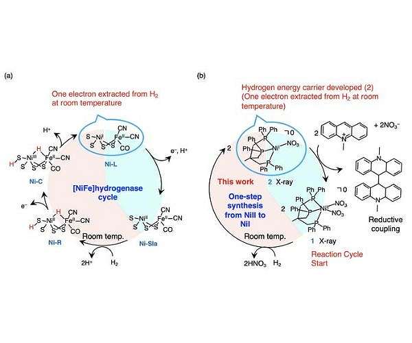 "So, we looked to nature for hints. There are a series of enzymes called hydrogenases that catalyze hydrogen into protons and electrons and can store that energy for later use, even at room temperature," continues Ogo. "By studying these enzymes our team was able to develop a new compound that does exactly that."