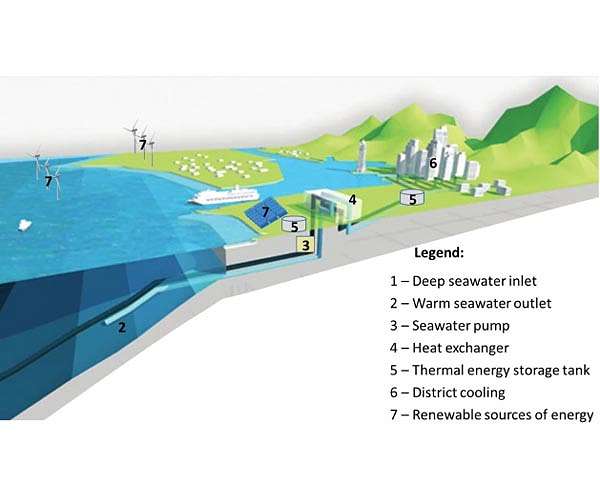 Month-on-month, year-on-year, the world continues to experience record high temperatures. In response to this and exacerbated by a growing global population, it is expected that air-conditioning demand will continue to rise. A new IIASA-led study explored the pros and cons of seawater air-conditioning as an alternative cooling solution. Conventional air-conditioning (AC) is the most common technology used for cooling and represents a considerable share of energy demand in warmer regions. An alternative that is not frequently considered, is seawater air-conditioning (SWAC) - a renewable alternative for cooling that involves pumping seawater from ocean depths of around 700 to 1200 meters and temperatures of 3C to 5C to the coast, where it exchanges heat with a district cooling system, and returns the warmer water to the ocean. According to the study published in the journal Energy Efficiency, just 1 m3 of seawater in a SWAC plant can provide the same cooling energy as that generated by 21 wind turbines or a solar power plant the size of 68 football fields. The researchers developed a computational model and methodology to estimate the cost of cooling with SWAC around the world, and also evaluated the possibility of using this system as an alternative for energy storage from variable renewable energy sources like wind and solar. The results show that whereas conventional air-conditioning systems require a low initial investment cost but the energy costs to operate them are high, for SWAC systems the opposite is true - while it has a higher initial investment cost, energy costs to operate the system is low. The main potential for SWAC is on small islands in tropical regions, where the distance from the coast to the deep ocean is small, energy costs are high, and warm average temperatures are common throughout the year. For example, in Puerto Plata where the electricity costs are $0.16/KWhe, the cost of conventional AC cooling is around $0.08/KWht. The SWAC solution would cost $ 0.042/KWht, which is 48% less than conventional technologies. In Nauru, assuming the same electricity cost, the SWAC solution would be $0.0185/KWht, which is 77% lower compared with conventional technologies. While district cooling is usually less viable than district heating systems, the low cost of cooling with SWAC processes makes district cooling over short distances a viable alternative. Possible customers with high cooling demands to connect to SWAC district cooling systems include airports, data centers, hotels and resorts, governmental and military facilities, universities, and commercial buildings. The findings further indicate that excess generation of electricity from variable renewable energy sources such as wind and solar energy can be balanced out with the variations in seawater flow in the pipeline of SWAC plants. This cold water would then be stored in thermal energy storage tanks to meet the cooling demand at any time. During months or seasons where cooling demand is low, the cold seawater can be used to increase the efficiency of a chiller to freeze sea or freshwater in the storage tanks. During the months when cooling demand is high, both the SWAC system and the energy stored as ice in the tanks can supply the cooling demand. In addition to the above, the paper also suggests a modification to the normal design that can increase the efficiency of SWAC projects with long pipelines, while allowing for expansion to meet growing cooling demand. The proposal involves increasing the excavation depth of the seawater pump station, which allows an increase in the velocity and flow rate of the seawater inlet pipeline. "We call this approach "High Velocity Seawater Air-conditioning". This design configuration allows such projects to be built with an initial cooling load and expand the cooling load modularly through smaller additional capital costs," explains study lead author Julian Hunt, who did this research during his postdoc at IIASA. Other advantages of SWAC includes its reliability as a non-intermittent renewable source of cooling, reduction of greenhouse gas emissions from cooling processes, and the reduction of water consumption in cooling systems. In addition, it could serve as a cheap alternative for large-scale cooling in tropical countries where it could reduce the costs of food and grain storage, thus helping to lower the vulnerability of developing countries to climate change. Given the recent interest in hydrogen production and hydrogen-based economies, SWAC could even be combined with hydrogen liquefaction plants where it could help to reduce energy consumption in the process to liquefy hydrogen by up to 10%. The researchers however caution that despite its potential and many advantages, this technology also has challenges. The return of the seawater should, for instance, be handled with extreme care to minimize its impact on coastal wildlife; retrofitting district cooling infrastructure and buildings could incur high capital costs; and there is a risk of thermal shock and increased nutrient loading in the deep seawater outlet. "While it does have its challenges, seawater air-conditioning is an innovative and sustainable technology that has great potential for expanding into a benchmark system for cooling in tropical locations close to the deep sea and will help fulfill our cooling needs in a warming world," Hunt concludes.
