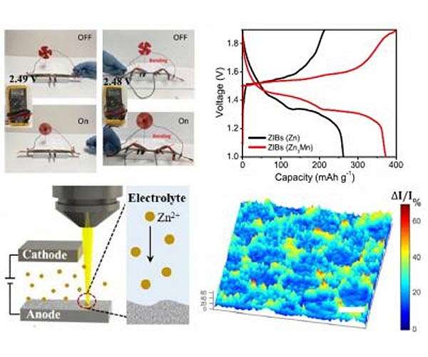 Lithium-ion batteries are critical for modern life, from powering our laptops and cell phones to those new holiday toys. But there is a safety risk - the batteries can catch fire. Zinc-based aqueous batteries avoid the fire hazard by using a water-based electrolyte instead of the conventional chemical solvent. However, uncontrolled dendrite growth limits their ability to provide the high performance and long life needed for practical applications. Now researchers have reported in Nature Communications that a new 3D zinc-manganese nano-alloy anode has overcome the limitations, resulting in a stable, high-performance, dendrite-free aqueous battery using seawater as the electrolyte. Xiaonan Shan, co-corresponding author for the work and an assistant professor of electrical and computer engineering at the University of Houston, said the discovery offers promise for energy storage and other applications, including electric vehicles. "It provides a low-cost, high energy density, stable battery," he said. "It should be of use for reliable, rechargeable batteries." Shan and UH PhD student Guangxia Feng also developed an in situ optical visualization technique, allowing them to directly observe the reaction dynamics on the anode in real time. "This platform provides us with the capability to directly image the electrode reaction dynamics in situ," Shan said. "This important information provides direct evidence and visualization of the reaction kinetics and helps us to understand phenomena that could not be easily accessed previously." Testing determined that the novel 3D zinc-manganese nano alloy anode remained stable without degrading throughout 1,000 hours of charge/discharge cycling under high current density (80 mA/cm2). The anode is the electrode which releases current from a battery, while electrolytes are the medium through which the ionic charge flows between the cathode and anode. Using seawater as the electrolyte rather than highly purified water offers another avenue for lowering battery cost. Traditional anode materials used in aqueous batteries have been prone to dendrites, tiny growths that can cause the battery to lose power. Shan and his colleagues proposed and demonstrated a strategy to efficiently minimize and suppress dendrite formation in aqueous systems by controlling surface reaction thermodynamics with a zinc alloy and reaction kinetics by a three-dimensional structure. Shan said researchers at UH and University of Central Florida are currently investigating other metal alloys, in addition to the zinc-manganese alloy.