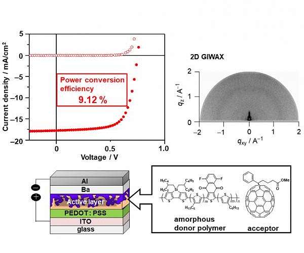 Humankind is in the midst of a massive drive to harness solar energy to power our homes, gadgets, and industry. Plastic solar cells, based on blends of conducting organic polymers, are of interest for making lightweight and cheap solar cells. The problem with these kinds of solar cells is that their solar power efficiencies are very closely related to the way the different types of materials mix and crystalize in thin films. This means complex and careful processing is usually needed to make efficient polymer solar cells. Now, researchers at Osaka University, in an international collaboration with Max Planck Institute for Polymer Research, have redesigned one of their previously reported polymers to make a new kind of solar cell that needs no extra special treatments. They also managed to keep excellent power conversion efficiency of solar power to electricity, as recently reported in Advanced Energy Materials. "Conventional organic solar cells have now achieved good efficiencies but the polymer films in these devices typically require special processing to ensure correct crystallization. Instead, we have been focusing on amorphous polymer blends to avoid these issues," lead author Yutaka Ie says. Organic solar cells work based on light energy exciting electrons in a polymer. The excited electrons can then transfer to a soccer ball-shaped fullerene and move to the positive side of the solar cell. The space left by an electron is known as a hole. It too must move through the polymer to the other side of the device to complete the circuit. The Osaka researchers knew that one of their polymers could not transport holes so effectively. They redesigned the structure by adding an extra component, which improved its hole conductivity, and in turn enhanced the solar power conversion performance. Coauthor Yoshio Aso says, "Being able to make these cells without having to pay such close attention to the crystal structure of the polymer films could allow us to mass produce these devices by simple printing methods, which should considerably lower costs of the devices and lead to much wider uptake."