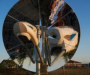 Natural gas power plants can use about 20 percent less fuel when the sun is shining by injecting solar energy into natural gas with a new system being developed by the Department of Energy's Pacific Northwest National Laboratory. The system converts natural gas and sunlight into a more energy-rich fuel called syngas, which power plants can burn to make electricity. "Our system will enable power plants to use less natural gas to produce the same amount of electricity they already make," said PNNL engineer Bob Wegeng, who is leading the project. "At the same time, the system lowers a power plant's greenhouse gas emissions at a cost that's competitive with traditional fossil fuel power." PNNL will conduct field tests of the system at its sunny campus in Richland, Wash., this summer. With the U.S. increasingly relying on inexpensive natural gas for energy, this system can reduce the carbon footprint of power generation. DOE's Energy Information Administration estimates natural gas will make up 27 percent of the nation's electricity by 2020. Wegeng noted PNNL's system is best suited for power plants located in sunshine-drenched areas such as the American Southwest. Installing PNNL's system in front of natural gas power plants turns them into hybrid solar-gas power plants. The system uses solar heat to convert natural gas into syngas, a fuel containing hydrogen and carbon monoxide. Because syngas has a higher energy content, a power plant equipped with the system can consume about 20 percent less natural gas while producing the same amount of electricity. This decreased fuel usage is made possible with concentrating solar power, which uses a reflecting surface to concentrate the sun's rays like a magnifying glass. PNNL's system uses a mirrored parabolic dish to direct sunbeams to a central point, where a PNNL-developed device absorbs the solar heat to make syngas.