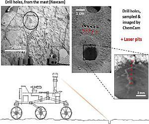 NASA's Curiosity Mars rover targeted the laser of the Chemistry and Camera (ChemCam) instrument with remarkable accuracy for assessing the composition of the wall of a drilled hole and tailings that resulted from the drilling. This graphic diagrams the pointing and shows the resulting pits created by the laser shots. On the 180th Martian day, or sol, of Curiosity's work on Mars (Feb. 6, 2013), the rover performed a "mini drill test," followed on Sol 182 (Feb. 8, 2013) by the actual drilling to collect a sample from the interior of the rock. Both holes in the target rock "John Klein" are visible in the image at upper left, taken on Sol 182 by the rover's Navigation Camera (Navcam). Both the Navcam and the ChemCam are at the top of the Curiosity's remote-sensing mast. Each drilled hole is about 0.63 inch (1.6 centimeters) wide, and they are located about 8 feet (about 2.5 meters) away from the top of the mast. So small, so far away... On Sol 227 (March 26, 2013), ChemCam fired its laser 150 times (5 bursts of 30 shots, each burst at a different target point) on the drill tailings between the two holes and 300 times (10 bursts of 30 shots) in the drill hole itself. The same day, ChemCam's remote micro-imager (RMI) captured images of the laser pits: small craters in the loose tailing (center photo from RMI), and tiny scrapes on the hard surface of the hole walls (photo at right from RMI). Composition spectra from the ChemCam laser inspection are under investigation.