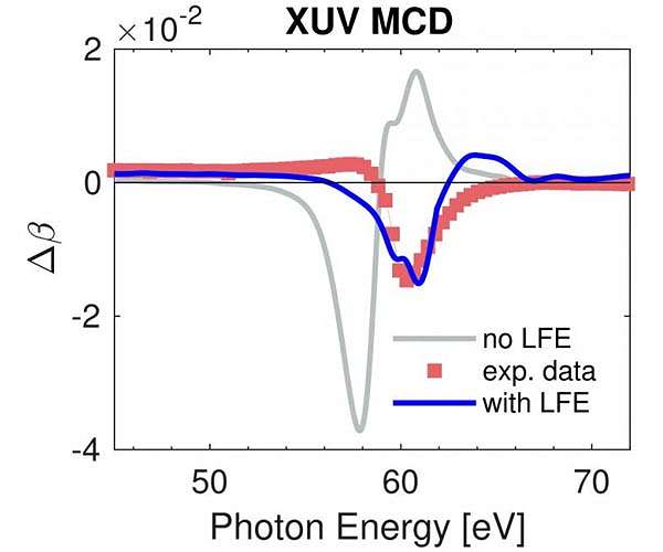 Probing magnetic materials with extreme ultraviolet radiation allows to obtain a detailed microscopic picture of how magnetic systems interact with light - the fastest way to manipulate a magnetic material. A team of researchers led by the Max Born Institute has now provided the experimental and theoretical groundwork to interpret such spectroscopic signals. The results were published in Physical Review Letters. The study of the interaction between light and matter is one of the most powerful ways to help physicists to understand the microscopic world. In magnetic materials, a wealth of information can be retrieved by optical spectroscopy where the energy of the individual light particles - photons - promotes inner shell electrons to higher energies. This is because such an approach allows to obtain the magnetic properties separately for the different types of atoms in the magnetic material and enables scientists to understand the role and interplay of the different constituents. This experimental technique, called X-ray magnetic circular dichroism (XMCD) spectroscopy, has been pioneered in the late 1980ties and typically requires a large-scale facility - a synchrotron radiation source or x-ray laser. To investigate how magnetization responds to ultrashort laser pulses - the fastest way to deterministically control magnetic materials - smaller-scale laboratory sources have become available in recent years delivering ultrashort pulses in the extreme ultraviolet (XUV) spectral range. XUV photons, being less energetic, excite less strongly bound electrons in the material, posing new challenges for the interpretation of the resulting spectra in terms of the underlying magnetization in the material. A team of researchers from the Max Born Institute in Berlin together with researchers from the Max-Planck-Institute for Microstructure Physics in Halle and Uppsala University in Sweden has now provided a detailed analysis of the magneto-optical response for XUV photons. They combined experiments with ab initio calculations, which take only the types of atoms and their arrangement in the material as input information. For the prototypical magnetic elements iron, cobalt and nickel, they were able to measure the response of these materials to XUV radiation in detail. The scientists find that the observed signals are not simply proportional to the magnetic moment at the respective element, and that this deviation is reproduced in theory when so-called local field effects are taken into account. Sangeeta Sharma, who provided the theoretical description, explains: "Local field effects can be understood as a transient rearrangement of electronic charge in the material, caused by the electric field of the XUV radiation used for the investigation. The response of the system to this perturbation has to be taken into account when interpreting the spectra." This new insight now allows to quantitatively disentangle signals from different elements in one material. "As most functional magnetic materials are made up from several elements, this understanding is crucial to study such materials, especially when we are interested in the more complex dynamic response when manipulating them with laser pulses", emphasizes Felix Willems, the first author of the study. "Combining experiment and theory, we are now ready to investigate how the dynamic microscopic processes may be utilized to achieve a desired effect, such as switching the magnetization on a very short time scale. This is of both fundamental and applied interest."