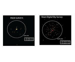 A new paper published this month in The Astronomical Journal by astronomers from the Sloan Digital Sky Survey (SDSS) reports a wellspring of new brown dwarf stellar companions, throwing cold water on the entire idea of the "brown dwarf desert," the previously mystifying lack of these sub-stellar objects around stars. Most stars in our Galaxy have a traveling companion. Often, these companions are stars of similar mass, as is the case for our nearest stellar neighbors, the triple star system Alpha Centauri. Our Sun, of course, has companions of its own - the planets of our Solar System. Planetary companions are vastly different from stellar companions: they are much smaller, and they do not shine with their own light created through nuclear fusion. Even the largest planet in our Solar System, Jupiter, would need to be 80 times more massive to even begin to shine this way. Stuck in the middle are "brown dwarfs," much bigger than Jupiter but still too small to be shining stars. These brown dwarfs give off merely a dim glow as they slowly cool. The Universe is full of stars, and now we know that it is full of planets too. Astronomers expected that the Universe would also be teeming with brown dwarfs. But strangely, that's not what they had been finding. Although astronomers have found plenty of brown dwarfs floating through space on their own, they found very few as stellar companions. Even in recent years, as new and sensitive detection techniques have allowed them to discover thousands of extrasolar planets, brown dwarfs have remained elusive - in spite of the fact that they should be easier to find than planets. In fact, until recently, so few brown dwarfs have been found orbiting close to other stars that astronomers refer to the phenomenon as the "brown dwarf desert." This in turn created a problem for theorists, who have been scrambling to explain why astronomers have found so few. Therefore when SDSS astronomers started sifting through their data looking for brown dwarf companions to stars, they were hoping not to come up completely dry. "We were shocked to find that so many of the stars in our sample have close-orbiting brown dwarf companions," says Nick Troup of the University of Virginia, lead author of the paper. "We never expected to triple the total number of known brown dwarf companions with only a few years' worth of observations." The team's success is due to an unlikely tool in the race to find low-mass stellar companions. The Apache Point Observatory Galactic Evolution Experiment (APOGEE) was designed as a substantial survey of stars in our Milky Way to make a large-scale map of their motions and chemical compositions. But the instrument built for the APOGEE project is so sensitive to small stellar motions that companions orbiting these stars can be detected with APOGEE data. When an object orbits a star, it tugs at it, causing the star to move on a little orbit of its own. For example, Jupiter tugs on the Sun enough to make it wobble around in space by more than its own diameter. To a distant observer, this wobble can be detected - and the mass of the tugging object can be determined - through changes in the motion of the star. This motion is seen through the Doppler effect, the same phenomenon that is the basis of the patrol officer's speed gun and the meteorologist's Doppler radar rain map. While APOGEE was designed to measure the grand motions of stars speeding around the Galaxy, it was never intended to do so at the subtle precisions needed to detect the much tinier wobbles induced by small sub-stellar companions. "This level of precision was a serendipitous bonus of the design of the APOGEE spectrograph", says John Wilson, University of Virginia astronomer and leader of the APOGEE instrument team. "The entire instrument has to be contained in a giant steel vessel in a vacuum at -320 degrees F, otherwise the instrument's own heat would swamp the infrared signals from the stars." It turns out that this tightly controlled environment makes it possible to use the APOGEE instrument to measure Doppler shifts reliably over the course of months or years, a feat not achievable by many other spectrographs. "Even with the first data obtained a few years ago, it was clear that we could use APOGEE to detect the motions of planet-sized objects around our target stars," says David Nidever of the University of Arizona and the Large Synoptic Survey Telescope, who was responsible for writing much of the software that measures the Doppler motions in APOGEE spectra. "It definitely opened our eyes to the possibilities of doing a more systematic search for planets and brown dwarfs." To undertake such a search, the team started with the 150,000 stars that APOGEE had observed. The astronomers winnowed that collection of stars down to a "prime sample" of about four hundred representing the best examples of stars with companions in the APOGEE data. Among these, they identified about 60 stars with evidence for planetary-mass candidates, which was already exciting. But the real surprise came with the researchers' extraordinary haul of 112 brown dwarf candidates - twice as many than had been found in the previous 15 years. Why has the APOGEE team been so lucky in finding this oasis of brown dwarfs? Troup thinks it may have to do with the types of host stars that they are looking at. "Most people doing planet searches have been interested in finding the next Earth, so they've focused their efforts on stars similar to the Sun," Troup says. "But we had to work with the stars that APOGEE surveyed, which are mostly giant stars." The reasons why brown dwarf companions are more common around giant stars is just one of many new questions raised by this new study that the Sloan team is investigating. And the team will continue to test their results with the ever-growing flow of APOGEE data. "It's completely unprecedented that this many brown dwarf companions have been found at once, so we are anxious to s