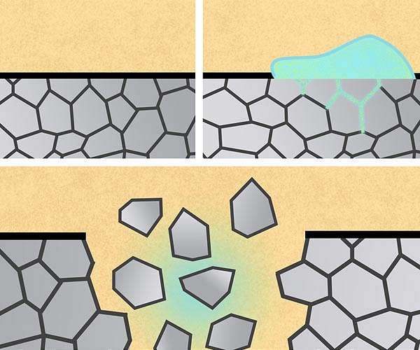 Breaking down metals Most of those devices are made from polymers, but recently the researchers have been exploring the possibility of using metals, which are stronger and more durable. However, one of the challenges of delivering metal devices is finding a way to remove them once they're no longer needed. To create devices that could be broken down on demand inside the body, the MIT team drew inspiration from a phenomenon known as liquid metal embrittlement. This process has been well-studied as a source of failure in metal structures, including those made from zinc and stainless steel. "It's known that certain combinations of liquid metals can actually get into the grain boundaries of solid metals and cause them to dramatically weaken and fail," Feig says. "We wanted to see if we could harness that known failure mechanism in a productive way to build these biomedical devices." One type of liquid metal that can induce embrittlement is gallium. For this study, the researchers used eutectic gallium-indium, an alloy of gallium that scientists have explored for a variety of applications in biomedicine as well as energy and flexible electronics. For the devices themselves, the researchers chose to use aluminum, which is known to be susceptible to embrittlement when exposed to gallium. Gallium weakens solid metals such as aluminum in two ways. First, it can diffuse through the grain boundaries of the metal - border lines between the crystals that make up the metal - causing pieces of the metal to break off. The MIT team showed that they could harness this phenomenon by designing metals with different types of grain structures, allowing the metals to break into small pieces or to fracture at a given point. Gallium also prevents aluminum from forming a protective oxide layer on its surface, which increases the metal's exposure to water and enhances its degradation. The MIT team showed that after they painted gallium-indium onto aluminum devices, the metals would disintegrate within minutes. The researchers also created nanoparticles and microparticles of gallium-indium and showed that these particles, suspended in fluid, could also break down aluminum structures.