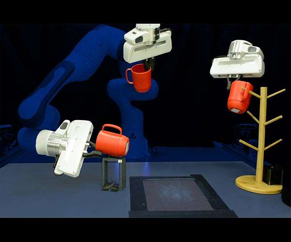 With e-commerce orders pouring in, a warehouse robot picks mugs off a shelf and places them into boxes for shipping. Everything is humming along, until the warehouse processes a change and the robot must now grasp taller, narrower mugs that are stored upside down. Reprogramming that robot involves hand-labeling thousands of images that show it how to grasp these new mugs, then training the system all over again. But a new technique developed by MIT researchers would require only a handful of human demonstrations to reprogram the robot. This machine-learning method enables a robot to pick up and place never-before-seen objects that are in random poses it has never encountered. Within 10 to 15 minutes, the robot would be ready to perform a new pick-and-place task. The technique uses a neural network specifically designed to reconstruct the shapes of 3D objects. With just a few demonstrations, the system uses what the neural network has learned about 3D geometry to grasp new objects that are similar to those in the demos. In simulations and using a real robotic arm, the researchers show that their system can effectively manipulate never-before-seen mugs, bowls, and bottles, arranged in random poses, using only 10 demonstrations to teach the robot. "Our major contribution is the general ability to much more efficiently provide new skills to robots that need to operate in more unstructured environments where there could be a lot of variability. The concept of generalization by construction is a fascinating capability because this problem is typically so much harder," says Anthony Simeonov, a graduate student in electrical engineering and computer science (EECS) and co-lead author of the paper. Simeonov wrote the paper with co-lead author Yilun Du, an EECS graduate student; Andrea Tagliasacchi, a staff research scientist at Google Brain; Joshua B. Tenenbaum, the Paul E. Newton Career Development Professor of Cognitive Science and Computation in the Department of Brain and Cognitive Sciences and a member of the Computer Science and Artificial Intelligence Laboratory (CSAIL); Alberto Rodriguez, the Class of 1957 Associate Professor in the Department of Mechanical Engineering; and senior authors Pulkit Agrawal, a professor in CSAIL, and Vincent Sitzmann, an incoming assistant professor in EECS. The research will be presented at the International Conference on Robotics and Automation.