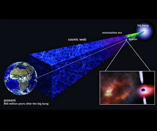 The discovery of a 13 billion-year-old cosmic cloud of gas enabled a team of Carnegie astronomers to perform the earliest-ever measurement of how the universe was enriched with a diversity of chemical elements. Their findings reveal that the first generation of stars formed more quickly than previously thought. The research, led by recent Carnegie-Princeton fellow Eduardo Banados and including the Carnegie's Michael Rauch and Tom Cooper, will be published by The Astrophysical Journal. The Big Bang started the universe as a hot, murky soup of extremely energetic particles that was rapidly expanding. As this material spread out, it cooled, and the particles coalesced into neutral hydrogen gas. The universe stayed dark, without any luminous sources, until gravity condensed matter into the first stars and galaxies. All stars, including this first generation, act as chemical factories, synthesizing almost all of the elements that make up the world around us. When the original stars exploded as supernovae, they spewed out the elements that they created, seeding the surrounding gas. Subsequent generations of stars incorporated these elements and steadily increased the chemical abundances of their surroundings. But the first stars formed in a still pristine, cold universe. Consequently these initial stars produced elements in different proportions than those synthesized by younger stars, which were formed in an environment that was already enriched by earlier generations. "Looking back in time far enough, one may expect cosmic gas clouds to show the tell-tale signature of the peculiar element ratios made by the first stars," said Rauch. "Peering even further back, we may ultimately witness the disappearance of most elements and the emergence of pristine gas." Astronomers have long used quasars to learn about the chemical composition of cosmic gas over time, showing how different generations of stars enrich their surroundings. "We found this ancient gas cloud when following up on an inventory of very distant quasars using the Magellan telescopes at Carnegie's Las Campanas Observatory in Chile," explained Banados, who is now a group leader at the Max-Planck Institute in Heidelberg. Quasars are tremendously luminous objects comprised of enormous black holes accreting matter at the centers of massive galaxies. Because the gas cloud exists between the quasar and us on Earth, the quasar's incredibly bright light must pass through it to get to us and astronomers can take advantage of this to understand the cloud's chemistry. This discovery presented an unprecedented opportunity to characterize a gas cloud from the first billion years of cosmic history. The team found that the cloud's chemical makeup was quite modern, and not as primitive as expected if dominated by the first stars. Although it formed only 850 million years after the Big Bang, its chemical abundances were already as high as those typically seen in cosmic gas clouds that were formed several billion years later. "Apparently, the first generation of stars had already expired by the time the cloud formed," Rauch explained. "This shows that the universe was rapidly swamped by the chemical products of later generations of stars, even before most of the present-day galaxies were in place." The team is optimistic that even-more-ancient gas clouds will eventually be discovered and that they will reveal information about the first stars in the universe.