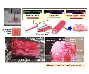 First 3D-bioprinted structured Wagyu beef-like meat unveiled Osaka, Japan (SPX) Aug 25, 2021 Scientists from Osaka University used stem cells isolated from Wagyu cows to 3D-print a meat alternative containing muscle, fat, and blood vessels arranged to closely resemble conventional steaks. This work may help usher in a more sustainable future with widely available cultured meat. Wagyu can be literally translated into "Japanese cow," and is famous around the globe for its high content of intramuscular fat, known as marbling or sashi. This marbling provides the beef its rich flavors and dist ... read more