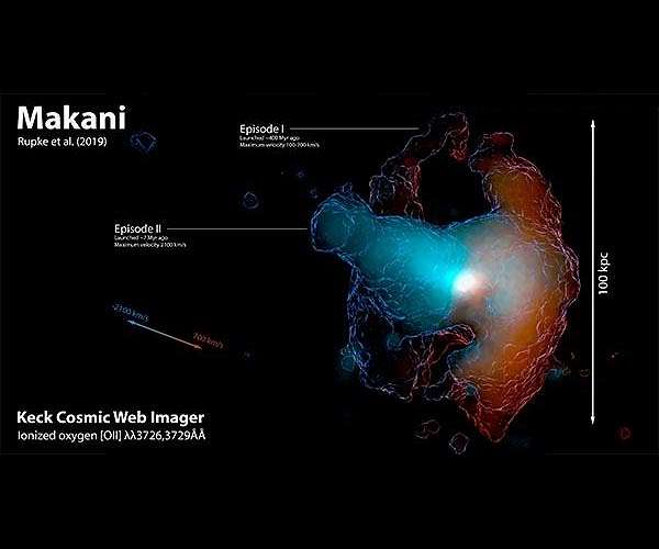 Exploring the influence of galactic winds from a distant galaxy called Makani, UC San Diego's Alison Coil, Rhodes College's David Rupke and a group of collaborators from around the world made a novel discovery. Published in Nature, their study's findings provide direct evidence for the first time of the role of galactic winds - ejections of gas from galaxies - in creating the circumgalactic medium (CGM). It exists in the regions around galaxies, and it plays an active role in their cosmic evolution. The unique composition of Makani - meaning wind in Hawaiian - uniquely lent itself to the breakthrough findings. "Makani is not a typical galaxy," noted Coil, a physics professor at UC San Diego. "It's what's known as a late-stage major merger - two recently combined similarly massive galaxies, which came together because of the gravitational pull each felt from the other as they drew nearer. Galaxy mergers often lead to starburst events, when a substantial amount of gas present in the merging galaxies is compressed, resulting in a burst of new star births. Those new stars, in the case of Makani, likely caused the huge outflows - either in stellar winds or at the end of their lives when they exploded as supernovae." Coil explained that most of the gas in the universe inexplicably appears in the regions surrounding galaxies - not in the galaxies. Typically, when astronomers observe a galaxy, they are not witnessing it undergoing dramatic events - big mergers, the rearrangement of stars, the creation of multiple stars or driving huge, fast winds. "While these events may occur at some point in a galaxy's life, they'd be relatively brief," noted Coil. "Here, we're actually catching it all right as it's happening through these huge outflows of gas and dust." Coil and Rupke, the paper's first author, used data collected from the W. M. Keck Observatory's new Keck Cosmic Web Imager (KCWI) instrument, combined with images from the Hubble Space Telescope and the Atacama Large Millimeter Array (ALMA), to draw their conclusions. The KCWI data provided what the researchers call the "stunning detection" of the ionized oxygen gas to extremely large scales, well beyond the stars in the galaxy. It allowed them to distinguish a fast gaseous outflow launched from the galaxy a few million year ago, from a gas outflow launched hundreds of millions of years earlier that has since slowed significantly. "The earlier outflow has flowed to large distances from the galaxy, while the fast, recent outflow has not had time to do so," summarized Rupke, associate professor of physics at Rhodes College. From the Hubble, the researchers procured images of Makani's stars, showing it to be a massive, compact galaxy that resulted from a merger of two once separate galaxies. From ALMA, they could see that the outflow contains molecules as well as atoms. The data sets indicated that with a mixed population of old, middle-age and young stars, the galaxy might also contain a dust-obscured accreting supermassive black hole. This suggests to the scientists that Makani's properties and timescales are consistent with theoretical models of galactic winds. "In terms of both their size and speed of travel, the two outflows are consistent with their creation by these past starburst events; they're also consistent with theoretical models of how large and fast winds should be if created by starbursts. So observations and theory are agreeing well here," noted Coil. Rupke noticed that the hourglass shape of Makani's nebula is strongly reminiscent of similar galactic winds in other galaxies, but that Makani's wind is much larger than in other observed galaxies. "This means that we can confirm it's actually moving gas from the galaxy into the circumgalactic regions around it, as well as sweeping up more gas from its surroundings as it moves out," Rupke explained. "And it's moving a lot of it - at least one to 10 percent of the visible mass of the entire galaxy - at very high speeds, thousands of kilometers per second." Rupke also noted that while astronomers are converging on the idea that galactic winds are important for feeding the CGM, most of the evidence has come from theoretical models or observations that don't encompass the entire galaxy. "Here we have the whole spatial picture for one galaxy, which is a remarkable illustration of what people expected," he said. "Makani's existence provides one of the first direct windows into how a galaxy contributes to the ongoing formation and chemical enrichment of its CGM."