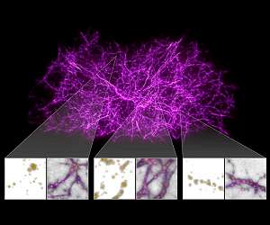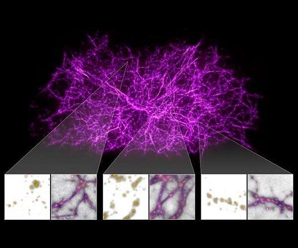 The single-cell organism known as slime mould (Physarum polycephalum) builds complex web-like filamentary networks in search of food, always finding near-optimal pathways to connect different locations. In shaping the Universe, gravity builds a vast cobweb-like structure of filaments tying galaxies and clusters of galaxies together along invisible bridges of gas and dark matter hundreds of millions of light-years long. There is an uncanny resemblance between the two networks, one crafted by biological evolution, the other by the primordial force of gravity. The cosmic web is the large-scale backbone of the cosmos, consisting primarily of dark matter and laced with gas, upon which galaxies are built. Even though dark matter cannot be seen, it makes up the bulk of the Universe's material. Astronomers have had a difficult time finding these elusive strands, because the gas within them is too dim to be detected. The existence of a web-like structure to the Universe was first hinted at in galaxy surveys in the 1980s. Since those studies, the grand scale of this filamentary structure has been revealed by subsequent sky surveys. The filaments form the boundaries between large voids in the Universe. Now a team of researchers has turned to slime mould to help them build a map of the filaments in the local Universe (within 100 million light-years of Earth) and find the gas within them. They designed a computer algorithm, inspired by the behaviour of slime mould, and tested it against a computer simulation of the growth of dark matter filaments in the Universe. A computer algorithm is essentially a recipe that tells a computer precisely what steps to take to solve a problem. The researchers then applied the slime mould algorithm to data containing the locations of over 37 000 galaxies mapped by the Sloan Digital Sky Survey. The algorithm produced a three-dimensional map of the underlying cosmic web structure. They then analysed the light from 350 faraway quasars catalogued in the Hubble Spectroscopic Legacy Archive. These distant cosmic flashlights are the brilliant black-hole-powered cores of active galaxies, whose light shines across space and through the foreground cosmic web. Imprinted on that light was the telltale signature of otherwise invisible hydrogen gas that the team analysed at specific points along the filaments. These target locations are far from the galaxies, which allowed the research team to link the gas to the Universe's large-scale structure. "It's really fascinating that one of the simplest forms of life actually enables insights into the very largest-scale structures in the Universe," said lead researcher Joseph Burchett of the University of California (UC), U.S.A. "By using the slime mould simulation to find the location of the cosmic web filaments, including those far from galaxies, we could then use the Hubble Space Telescope's archival data to detect and determine the density of the cool gas on the very outskirts of those invisible filaments. Scientists have detected signatures of this gas for over half a century, and we have now proven the theoretical expectation that this gas comprises the cosmic web." The survey further validates research that indicates intergalactic gas is organised into filaments and also reveals how far away gas is detected from the galaxies. Team members were surprised to find gas associated with the cosmic web filaments more than 10 million light-years away from the galaxies. But that wasn't the only surprise. They also discovered that the ultraviolet signature of the gas gets stronger in the filaments' denser regions, but then disappears. "We think this discovery is telling us about the violent interactions that galaxies have in dense pockets of the intergalactic medium, where the gas becomes too hot to detect," Burchett said. The researchers turned to slime mould simulations when they were searching for a way to visualise the theorised connection between the cosmic web structure and the cool gas, detected in previous Hubble spectroscopic studies. Then team member Oskar Elek, a computer scientist at UC Santa Cruz, discovered online the work of Sage Jenson, a Berlin-based media artist. Among Jenson's works were mesmerizing artistic visualisations showing the growth of a slime mould's tentacle-like network of structures moving from one food source to another. Jenson's art was based on scientific work from 2010 by Jeff Jones of the University of the West of England in Bristol, which detailed an algorithm for simulating the growth of slime mould. The research team was inspired by how the slime mould builds complex filaments to capture new food, and how this mapping could be applied to how gravity shapes the Universe, as the cosmic web constructs the strands between galaxies and galaxy clusters. Based on the simulation outlined in Jones's paper, Elek developed a three-dimensional computer model of the buildup of slime mould to estimate the location of the cosmic web's filamentary structure.