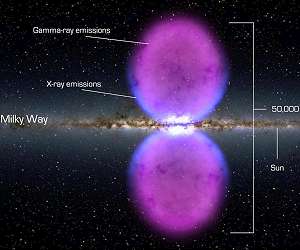 A team of scientists from Russia and China has developed a model which explains the nature of high-energy cosmic rays (CRs) in our Galaxy. These CRs have energies exceeding those produced by supernova explosions by one or two orders of magnitude. The model focuses mainly on the recent discovery of giant structures called Fermi bubbles. One of the key problems in the theory of the origin of cosmic rays (high-energy protons and atomic nuclei) is their acceleration mechanism. The issue was addressed by Vitaly Ginzburg and Sergei Syrovatsky in the 1960s when they suggested that CRs are generated during supernova (SN) explosions in the Galaxy. A specific mechanism of charged particle acceleration by SN shock waves was proposed by Germogen Krymsky and others in 1977. Due to the limited lifetime of the shocks, it is estimated that the maximum energy of the accelerated particles cannot exceed 1014-1015 eV (electronvolts). The question arises of how to explain the nature of particles with energies above 1015 eV. A major breakthrough in researching the acceleration processes of such particles came when the Fermi Gamma-ray Space Telescope detected two gigantic structures emitting radiation in gamma-ray band in the central area of the Galaxy in November 2010. The discovered structures are elongated and are symmetrically located in the Galactic plane perpendicular to its center, extending 50,000 light-years, or roughly half of the diameter of the Milky Way disk. These structures became known as Fermi bubbles. Later, the Planck telescope team discovered their emission in the microwave band. The nature of Fermi bubbles is still unclear, however the location of these objects indicates their connection to past or present activity in the center of the galaxy, where a central black hole of 106 solar masses is believed to be located. Modern models relate the bubbles to star formation and/or an energy release in the Galactic center as a result of tidal disruption of stars during their accretion onto a central black hole. The bubbles are not considered to be unique phenomena observed only in the Milky Way and similar structures can be detected in other galactic systems with active nuclei. Dmitry Chernyshov (MIPT graduate), Vladimir Dogiel (MIPT staff member) and their colleagues from Hong Kong and Taiwan have published a series of papers on the nature of Fermi bubbles. They have shown that X-ray and gamma-ray emission in these areas is due to various processes involving relativistic electrons accelerated by shock waves resulting from stellar matter falling into a black hole. In this case, the shock waves should accelerate both protons and nuclei. However, in contrast to electrons, relativistic protons with bigger masses hardly lose their energy in the Galactic halo and can fill up the entire volume of the galaxy. The authors of the paper suggest that giant Fermi bubbles shock fronts can re-accelerate protons emitted by SN to energies greatly exceeding 1015 eV. Analysis of cosmic ray re-acceleration showed that Fermi bubbles may be responsible for the formation of the CR spectrum above the "knee" of the observed spectrum, i.e., at energies greater than 3+ 1015 eV. To put this into perspective, the energy of accelerated particles in the Large Hadron Collider is also ~1015 eV. "The proposed model explains the spectral distribution of the observed CR flux. It can be said that the processes we described are capable of re-accelerating galactic cosmic rays generated in supernova explosions. Unlike electrons, protons have a significantly greater lifetime, so when accelerated in Fermi bubbles, they can fill up the volume of the Galaxy and be observed near the Earth. "Our model suggests that the cosmic rays containing high-energy protons and nuclei with energy lower than 1015 eV (below the energy range of the observed spectrum's "knee"), were generated in supernova explosions in the Galactic disk. Such CRs are re-accelerated in Fermi bubbles to energies over 1015 eV (above the "knee"). The final cosmic ray distribution is shown on the spectral diagram," says Vladimir Dogiel. The researchers have proposed an explanation for the peculiarities in the CR spectrum in the energy range from 3+ 1015 to 1018 eV. The scientists have proven that particles produced during the SN explosions and which have energies lower than 3+ 1015 eV experience re-acceleration in Fermi bubbles when they move from the galactic disk to the halo. Reasonable parameters of the model describing the particles' acceleration in Fermi bubbles can explain the nature of the spectrum of cosmic rays above 3+ 1015 eV. The spectrum below this range remains undisturbed. Thus, the model is able to produce spectral distribution of cosmic rays that is identical to the one observed.