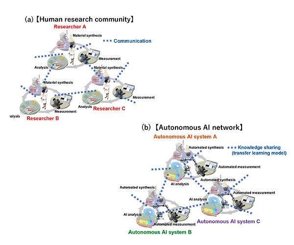 Human research communities provide a model for more effective collaboration. Researchers in different fields form networks through ongoing communication, exchanging not just raw data but distilled knowledge and insights. By sharing principles, trends, and conceptual links rather than entire datasets, human researchers can build on each other's work and accelerate discovery across diverse domains. The NIMS and University of Tsukuba team set out to replicate this style of knowledge-centric collaboration among autonomous AI systems engaged in materials exploration.
