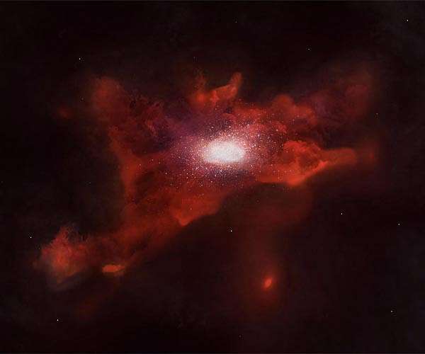 Researchers have discovered gigantic clouds of gaseous carbon spanning more than a radius of 30,000 light-years around young galaxies using the Atacama Large Millimeter/submillimeter Array (ALMA) in Chile. This is the first confirmation that carbon atoms produced inside of stars in the early Universe have spread beyond galaxies. No theoretical studies have predicted such huge carbon cocoons around growing galaxies, which raises questions about our current understanding of cosmic evolution. The result was obtained by Seiji Fujimoto and his colleagues, rather unconventionally, by examining data from former observations. He is currently employed at The Cosmic Dawn Center at the Niels Bohr Institute, University of Copenhagen. The study is now published in Astrophysical Journal.