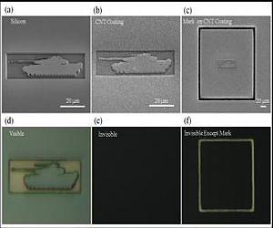 Carbon nanotubes, tiny cylinders composed of one-atom-thick carbon lattices, have gained fame as one of the strongest materials known to science. Now a group of researchers from the University of Michigan is taking advantage of another one of carbon nanotubes' unique properties, the low refractive index of low-density aligned nanotubes, to demonstrate a new application: making 3-D objects appear as nothing more than a flat, black sheet. The refractive index of a material is a measure of how much that material slows down light, and carbon nanotube "forests" have a low index of refraction very close to that of air. Since the two materials affect the passage of light in similar ways, there is little reflection and scattering of light as it passes from air into a layer of nanotubes. The Michigan team realized they could use this property to visually hide the structure of objects. As described in the AIP's journal Applied Physics Letters, the scientists manufactured a 3-D image of a tank out of silicon. When the image was illuminated with white light, reflections revealed the tank's contours, but after the researchers grew a forest of carbon nanotubes on top of the tank, the light was soaked up by the tank's coating, revealing nothing more than a black sheet. By absorbing instead of scattering light, carbon nanotube coatings could cloak an object against a black background, such as that of deep space, the researchers note. In such cases the carbon nanotube forest "acts as a perfect magic black cloth that can completely conceal the 3-D structure of the object," the researchers write. "Low density carbon nanotube forest as an index-matched and near perfect absorption coating" is accepted for publication in Applied Physics Letters. Authors: Haofei Shi (1), Jong G. Ok (2), Hyoung Won Baac, (1) and L. Jay Guo (1).