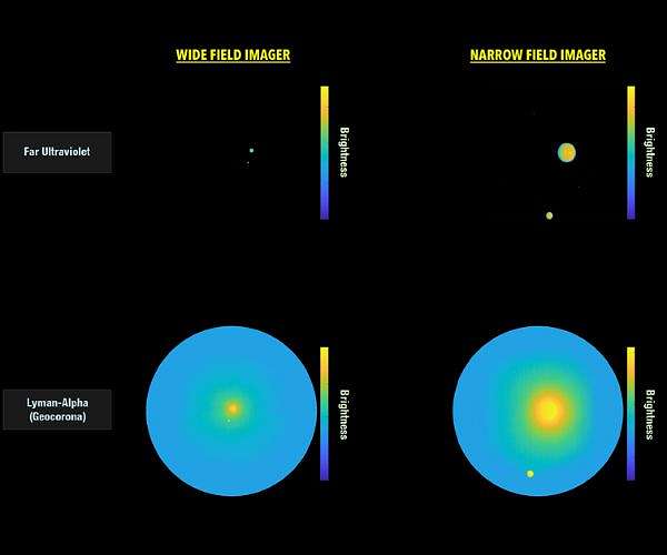 The observatory's Wide Field Imager and Narrow Field Imager each obtained two views: one using a broad far-ultraviolet filter and another tuned to light from Earth's geocorona. In each image, Earth appears as the larger bright circle near the center of the frame, while the Moon shows up as a smaller circle positioned below and to the left.