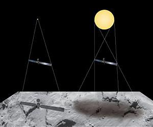 Images from the OSIRIS scientific imaging camera taken during the close flyby on 14 February have now been downlinked to Earth, revealing the surface of Comet 67P/C-G in unprecedented detail, and including the shadow of the spacecraft encircled in a wreath of light. The image released shows an area near the edge of the comet's "belly" close to the Imhotep-Ash regional boundary, where a mesh of steep slopes separates smooth-looking terrains from a craggier area. The image was taken from a distance of 6 km from the comet's surface and has a resolution of 11 cm/pixel. It covers an area of 228 x 228 m. To better identify the exact region on the comet, in the graphic below we compare the new OSIRIS narrow-angle camera image with a wider view of the comet, along with the NAVCAM image taken at 14:15 UT, noting that there are uncertainties in the distance to the surface and change in perspective between the images. Indeed, while the match on the smooth-looking region at the bottom of the NAC image in the displayed orientation is good, it is harder to match the upper half because of the lack of shadows in the NAC image, and because the geometry/viewing perspective has changed between the images. This means that the NAC image would have to be distorted and "draped" over the surface to fit the NAVCAM properly. To better understand the relationship of the images, you can download a short movie that fades through the images here. During the flyby, Rosetta not only passed closer by the comet than ever before, but also passed through a unique observational geometry: for a short time the Sun, spacecraft, and comet were exactly aligned. In this geometry, surface structures cast almost no shadows, and therefore the reflection properties of the surface material can be discerned. "Images taken from this viewpoint are of high scientific value," says OSIRIS Principal Investigator Holger Sierks from the Max Planck Institute for Solar System Research (MPS) in Germany. "This kind of view is key for the study of grain sizes." As a side effect of this exceptional observational geometry, Rosetta's shadow can be seen cast on the surface of Comet 67P/C-G as a fuzzy rectangular-shaped dark spot surrounded by a bright halo-like region. The shadow is fuzzy and somewhat larger than Rosetta itself, measuring approximately 20 x 50 metres. If the Sun were a point source, the shadow would be sharp and almost exactly the same size as Rosetta (approximately 2 x 32 m). However, even at 347 million km from 67P/C-G on 14 February, the Sun appeared as a disc about 0.2 degrees across (about 2.3 times smaller than on Earth), resulting in a fuzzy "penumbra" around the spacecraft's shadow on the surface. In this scenario and with Rosetta 6 km above the surface, the penumbra effect adds roughly 20 metres to the spacecraft's dimensions, and which is cast onto the tilted surface of the comet. If you were standing on the surface with Rosetta high above you, there would be no place in the shadow where the entire Sun would be blocked from view, which explains why there is no fully dark core to the shadow. Rosetta is not the first spacecraft to capture its own shadow in this way. In 2005, JAXA's Hayabusa spacecraft captured its shadow on asteroid Itokawa. However, because Hayabusa was only a few tens of metres above the surface, the penumbral effect was much less, resulting in a sharper and darker shadow of the spacecraft. Also, the comet surface surrounding Rosetta's shadow on Comet 67P/C-G appears significantly brighter than the rest of the surface seen in the image. Scientists refer to this effect as the 'opposition surge' and it is commonly observed when highly-structured regolith surfaces on planets and moons are illuminated directly behind the observer. For example, astronauts on the lunar surface saw the effect surrounding their own shadows. The primary cause of opposition surge is 'shadow hiding'. When the Sun is directly behind the observer, the shadows cast by small grains disappear from the perspective of the observer, hidden behind the grains themselves, leading to a pronounced increase in brightness. There may also be a contribution from coherent backscatter due to the retro-reflective properties of small dust grains.