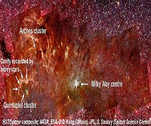 A team of scientists led by astronomers at the University of Bonn discovered an unusual phenomenon in the centre of the Milky Way: They detected about 20 rotating dust and gas discs in each cluster hosting exceptionally large and hot stars. The existence of these discs in the presence of the destructive UV radiation field of their massive neighbours came as a surprise. The science team is pondering how these rotating discs are able to withstand evaporation under these extreme conditions. The results are published in the most recent edition of the journal Astronomy and Astrophysics. The centre of the Milky Way is a nursery for young stars: In its very heart, more young stars are born in dark clouds than in any other place in the Galaxy. These stars form in rich groups such as the "Quintuplet" and "Arches" clusters which were the research focus of a science team under leadership of the University of Bonn's Argelander Institute for Astronomy. Both star clusters are merely a few million years young and contain stars as massive as 100 times the mass of the Sun. "We expected that the enormous radiative energy of these giant beasts evaporate the material around their smaller neighbours in less than one million years," says Dr. Andrea Stolte of the Argelander Institute for Astronomy at the University of Bonn.