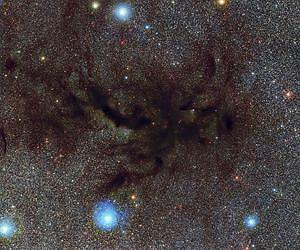 Just as Rene Magritte wrote "This is not a pipe" on his famous painting, this is also not a pipe. It is however a picture of part of a vast dark cloud of interstellar dust called the Pipe Nebula. This new and very detailed image of what is also known as Barnard 59 was captured by the Wide Field Imager on the MPG/ESO 2.2-metre telescope at ESO's La Silla Observatory. By coincidence this image is appearing on the 45th anniversary of the painter's death. The Pipe Nebula is a prime example of a dark nebula. Originally, astronomers believed these were areas in space where there were no stars. But it was later discovered that dark nebulae actually consist of clouds of interstellar dust so thick it can block out the light from the stars beyond. The Pipe Nebula appears silhouetted against the rich star clouds close to the centre of the Milky Way in the constellation of Ophiuchus (The Serpent Bearer). Barnard 59 forms the mouthpiece of the Pipe Nebula [1] and is the subject of this new image from the Wide Field Imager on the MPG/ESO 2.2-metre telescope. This strange and complex dark nebula lies about 600-700 light-years away from Earth. The nebula is named after the American astronomer Edward Emerson Barnard who was the first to systematically record dark nebulae using long-exposure photography and one of those who recognised their dusty nature. Barnard catalogued a total of 370 dark nebulae all over the sky. A self-made man, he bought his first house with the prize money from discovering several comets. Barnard was an extraordinary observer with exceptional eyesight who made contributions in many fields of astronomy in the late 19th and early 20th century. At first glance, your attention is most likely drawn to the centre of the image where dark twisting clouds look a little like the legs of a vast spider stretched across a web of stars. However, after a few moments you will begin to notice several finer details. Foggy, smoky shapes in the middle of the darkness are lit up by new stars that are forming. Star formation is common within regions that contain dense, molecular clouds, such as in dark nebulae. The dust and gas will clump together under the influence of gravity and more and more material will be attracted until the star is formed. However, compared to similar regions, the Barnard 59 region is undergoing relatively little star formation and still has a great deal of dust. If you look carefully you may also be able to spot more than a dozen tiny blue, green and red strips scattered across the picture. These are asteroids, chunks of rock and metal a few kilometres across that are orbiting the Sun. The majority lie in the asteroid belt between the orbits of Mars and Jupiter. Barnard 59 is about ten million times further away from the Earth than these tiny objects [2]. And finally, as you take in this richly textured tapestry of celestial objects, consider for a moment that when you look up at this region of sky from Earth you would be able to fit this entire image under your thumb held at arms-length despite it being about six light-years across at the distance of Barnard 59. [1] The entire Pipe Nebula is comprised of Barnard 65, 66, 67 and 78, in addition to Barnard 59. It can be seen easily with the unaided eye under dark and clear skies and is best spotted from southern latitudes where it appears higher in the sky. [2] Asteroids move during the exposures and create short trails. As this picture was created from several images taken in different colours at different times the different colour trails are also shifted relative to each other.