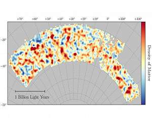 Imagine planting a single seed and, with great precision, being able to predict the exact height of the tree that grows from it. Now imagine traveling to the future and snapping photographic proof that you were right. If you think of the seed as the early universe, and the tree as the universe the way it looks now, you have an idea of what the Dark Energy Survey (DES) collaboration has just done. In a presentation at the American Physical Society Division of Particles and Fields meeting at the U.S. Department of Energy's (DOE) Fermi National Accelerator Laboratory, DES scientists will unveil the most accurate measurement ever made of the present large-scale structure of the universe. These measurements of the amount and "clumpiness" (or distribution) of dark matter in the present-day cosmos were made with a precision that, for the first time, rivals that of inferences from the early universe by the European Space Agency's orbiting Planck observatory. The new DES result (the tree, in the above metaphor) is close to "forecasts" made from the Planck measurements of the distant past (the seed), allowing scientists to understand more about the ways the universe has evolved over 14 billion years. "This result is beyond exciting," said Scott Dodelson of Fermilab, one of the lead scientists on this result. "For the first time, we're able to see the current structure of the universe with the same clarity that we can see its infancy, and we can follow the threads from one to the other, confirming many predictions along the way." Most notably, this result supports the theory that 26 percent of the universe is in the form of mysterious dark matter and that space is filled with an also-unseen dark energy, which is causing the accelerating expansion of the universe and makes up 70 percent. Paradoxically, it is easier to measure the large-scale clumpiness of the universe in the distant past than it is to measure it today. In the first 400,000 years following the Big Bang, the universe was filled with a glowing gas, the light from which survives to this day. Planck's map of this cosmic microwave background radiation gives us a snapshot of the universe at that very early time. Since then, the gravity of dark matter has pulled mass together and made the universe clumpier over time. But dark energy has been fighting back, pushing matter apart. Using the Planck map as a start, cosmologists can calculate precisely how this battle plays out over 14 billion years. "The DES measurements, when compared with the Planck map, support the simplest version of the dark matter/dark energy theory," said Joe Zuntz, of the University of Edinburgh, who worked on the analysis. "The moment we realized that our measurement matched the Planck result within 7 percent was thrilling for the entire collaboration." The primary instrument for DES is the 570-megapixel Dark Energy Camera, one of the most powerful in existence, able to capture digital images of light from galaxies eight billion light-years from Earth. The camera was built and tested at Fermilab, the lead laboratory on the Dark Energy Survey, and is mounted on the National Science Foundation's 4-meter Blanco telescope, part of the Cerro Tololo Inter-American Observatory in Chile, a division of the National Optical Astronomy Observatory. The DES data are processed at the National Center for Supercomputing Applications at the University of Illinois at Urbana-Champaign. Scientists on DES are using the camera to map an eighth of the sky in unprecedented detail over five years. The fifth year of observation will begin in August. The new results released today draw from data collected only during the survey's first year, which covers 1/30th of the sky. "It is amazing that the team has managed to achieve such precision from only the first year of their survey," said National Science Foundation Program Director Nigel Sharp. "Now that their analysis techniques are developed and tested, we look forward with eager anticipation to breakthrough results as the survey continues." DES scientists used two methods to measure dark matter. First, they created maps of galaxy positions as tracers, and second, they precisely measured the shapes of 26 million galaxies to directly map the patterns of dark matter over billions of light-years, using a technique called gravitational lensing. To make these ultraprecise measurements, the DES team developed new ways to detect the tiny lensing distortions of galaxy images, an effect not even visible to the eye, enabling revolutionary advances in understanding these cosmic signals. In the process, they created the largest guide to spotting dark matter in the cosmos ever drawn (see image). The new dark matter map is 10 times the size of the one DES released in 2015 and will eventually be three times larger than it is now. "It's an enormous team effort and the culmination of years of focused work," said Erin Sheldon, a physicist at the DOE's Brookhaven National Laboratory, who co-developed the new method for detecting lensing distortions. These results and others from the first year of the Dark Energy Survey will be released online and announced during a talk by Daniel Gruen, NASA Einstein fellow at the Kavli Institute for Particle Astrophysics and Cosmology at DOE's SLAC National Accelerator Laboratory, at 5 p.m. Central time. The talk is part of the APS Division of Particles and Fields meeting at Fermilab and will be streamed live. The results will also be presented by Kavli fellow Elisabeth Krause of the Kavli Insitute for Particle Astrophysics and Cosmology at SLAC at the TeV Particle Astrophysics Conference in Columbus, Ohio, on Aug. 9; and by Michael Troxel, postdoctoral fellow at the Center for Cosmology and AstroParticle Physics at Ohio State University, at the International Symposium on Lepton Photon Interactions at High Energies in Guanzhou, China, on Aug. 10. All three of these speakers are coordinators of DES science working groups and made k
