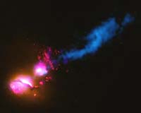 Washington DC (SPX) Dec 18, 2007 A powerful jet from a super massive black hole is blasting a nearby galaxy, according to new findings from NASA observatories. This never-before witnessed galactic violence may have a profound effect on planets in the jet's path and trigger a burst of star formation in its destructive wake. Known as 3C321, the system contains two galaxies in orbit around each other. Data from NASA's Chandra X-ray Observatory show both galaxies contain super massive black holes at their centers, but the larger galaxy has a jet emanating from the vicinity of its black hole. The smaller galaxy apparently has swung into the path of this jet. This "death star" galaxy was discovered through the combined efforts of both space and ground-based telescopes. NASA's Chandra X-ray Observatory, Hubble Space Telescope, and Spitzer Space Telescope were part of the effort. The Very Large Array telescope, Socorro, N.M., and the Multi-Element Radio Linked Interferometer Network (MERLIN) telescopes in the United Kingdom also were needed for the finding. "We've seen many jets produced by black holes, but this is the first time we've seen one punch into another galaxy like we're seeing here," said Dan Evans, a scientist at the Harvard-Smithsonian Center for Astrophysics and leader of the study. "This jet could be causing all sorts of problems for the smaller galaxy it is pummeling." Jets from super massive black holes produce high amounts of radiation, especially high-energy X-rays and gamma-rays, which can be lethal in large quantities. The combined effects of this radiation and particles traveling at almost the speed of light could severely damage the atmospheres of planets lying in the path of the jet. For example, protective layers of ozone in the upper atmosphere of planets could be destroyed. Jets produced by super massive black holes transport enormous amounts of energy far from black holes and enable them to affect matter on scales vastly larger than the size of the black hole. Learning more about jets is a key goal for astrophysical research. "We see jets all over the universe, but we're still struggling to understand some of their basic properties," said co-investigator Martin Hardcastle of the University of Hertfordshire in the United Kingdom. "This system of 3C321 gives us a chance to learn how they're affected when they slam into something like a galaxy and what they do after that." The effect of the jet on the companion galaxy is likely to be substantial, because the galaxies in 3C321 are extremely close at a distance of only about 20,000 light years apart. They lie approximately the same distance as Earth is from the center of the Milky Way galaxy. A bright spot in the Very Large Array and MERLIN images shows where the jet has struck the side of the galaxy, dissipating some of the jet's energy. The collision disrupted and deflected the jet. Another unique aspect of the discovery in 3C321 is how relatively short-lived this event is on a cosmic time scale. Features seen in the Very Large Array and Chandra images indicate that the jet began impacting the galaxy about one million years ago, a small fraction of the system's lifetime. This means such an alignment is quite rare in the nearby universe, making 3C321 an important opportunity to study such a phenomenon. It is possible the event is not all bad news for the galaxy being struck by the jet. The massive influx of energy and radiation from the jet could induce the formation of large numbers of stars and planets after its initial wake of destruction is complete. The results from Evans and his colleagues will appear in The Astrophysical Journal. NASA's Marshall Space Flight Center, Huntsville, Ala., manages the Chandra program for the agency's Science Mission Directorate. The Smithsonian Astrophysical Observatory controls science and flight operations from the Chandra X-ray Center in Cambridge, Mass. Community Email This Article Comment On This Article Related Links Chandra X-ray Center Understanding Time and Space