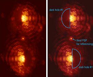 Astronomers have successfully commissioned a new type of optic that can reveal the image of an exoplanet next to its parent star. The 'vector Apodizing Phase Plate' (vector-APP) coronagraph was installed at the 6.5-m Magellan Clay telescope in Chile in May 2015, and the first observations demonstrated an unprecedented contrast performance very close to the star, where planets are more likely to reside. These results will be presented by PhD student Gilles Otten this Monday afternoon to the scientific community at the "In the Spirit of Lyot" conference organized by the Centre for Research in Astrophysics of Quebec and researchers at the University of Montreal. Almost 2000 exoplanets have been detected to date, but only a handful of those have been imaged directly. Exoplanets are typically more than a million times fainter than and are lost in the glare of their parent star as seen from Earth. To directly image exoplanets and to characterize their atmospheres, astronomical instruments at the world's largest telescopes use coronagraphs to suppress the overwhelming halo of light from the star. The vector-APP coronagraph[1] uses the wavelike nature of light to cancel out the starlight whilst allowing the planet's light to shine through. This manipulation is implemented through a complex phase pattern that can only be manufactured using advanced liquid crystal 3D patterning techniques [2]. This technique creates two images of the star, for which dark D-shaped regions are located on opposite sides of each star image. In this way, the whole region around the star can be scrutinized for planets. By combining several layers of liquid crystals, the device can be used over a wide range of wavelengths, including the infrared where the contrast between planet and star is more favorable. On May 6, 2015 a vector-APP coronagraphic device saw first light (at 3.9 m wavelength, in the infrared range of the spectrum) at the MagAO[3] instrument, attached to the 6.5-m diameter Magellan Clay telescope in Chile. The telescope's integrated adaptive optics system provided the instrument with sharp images of stars, which were consequently split up and modified by the coronagraph to exhibit dark holes in which much fainter planets could be imaged than without the vector-APP coronagraph. Frans Snik, who invented the principle behind the new vector-APP coronagraph, says: "It is fantastic to see that after all our design work and lab testing, this new approach works perfectly at the telescope on the very first night!" Gilles Otten adds: "We knew that we were in business as soon as we saw the first picture on the screen in the telescope control room." Jared Males is excited about the opportunities of the vector-APP: "With this new coronagraph we are now looking for planets around nearby stars. We have the capacity to directly detect, or rule out, planets smaller than Jupiter." Matthew Kenworthy concludes: "This new coronagraph technology is also excellent news for the extremely large telescopes currently under construction. Thermal infrared instruments such as the Mid-infrared E-ELT Imager and Spectrograph (METIS) can exploit this new technology and discover new worlds. With a vector-APP coronagraph in the next generation of telescopes, we can search for planets around nearby stars with unprecedented sensitivity." The advanced liquid crystal technology that the team adopted also permitted the production of extreme vector-APP designs that are not possible with more traditional manufacturing technologies. These new designs produce dark holes that cover the full 360 degrees around the target stars. The first data from an experimental device already shows the viability of this novel approach.