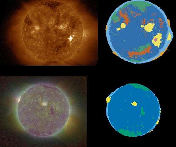 Computers can learn to find solar flares and other events in vast streams of solar images and help NOAA forecasters issue timely alerts, according to a new study. The machine-learning technique, developed by scientists at CIRES and NOAA's National Centers for Environmental Information (NCEI), searches massive amounts of satellite data to pick out features significant for space weather. Changing conditions on the Sun and in space can affect various technologies on Earth, blocking radio communications, damaging power grids, and diminishing navigation system accuracy. "Being able to process solar data in real time is important because flares erupting on the Sun impact Earth over the course of minutes. These techniques provide a rapid, continuously updated overview of solar features and can point us to areas requiring more scrutiny," said Rob Steenburgh, a forecaster in the NOAA Space Weather Prediction Center (SWPC) in Boulder. The research was published in October in the Journal of Space Weather and Space Climate. To predict incoming space weather, forecasters summarize current conditions on the Sun twice daily. Today, they use hand-drawn maps labeled with various solar features - including, active regions, filaments, and coronal hole boundaries. But solar imagers produce a new set of observations every few minutes. For example, the Solar Ultraviolet Imager (SUVI) on NOAA's GOES-R Series satellites runs on a 4-minute cycle, collecting data in six different wavelengths every cycle. Just keeping up with all of that data could take up a lot of a forecaster's time. "We need tools to process solar data into digestible chunks," said Dan Seaton, a CIRES scientist working at NCEI and one of the paper's co-authors. CIRES is part of the University of Colorado Boulder. So J. Marcus Hughes, a computer science graduate student at CU Boulder, CIRES scientist in NCEI and lead author of the study, created a computer algorithm that can look at all the SUVI images simultaneously and spot patterns in the data. With his colleagues, Hughes created a database of expert-labeled maps of the Sun and used those images to teach a computer to identify solar features important for forecasting. "We didn't tell it how to identify those features, but what to look for - things like flares, coronal holes, bright regions, filaments, and prominences. The computer learns the how through the algorithm," Hughes said. The algorithm identifies solar features using a decision-tree approach that follows a set of simple rules to distinguish between different traits. It examines an image one pixel at a time and decides, for example, whether that pixel is brighter or dimmer than a certain threshold before sending it down a branch of the tree. This repeats until, at the very bottom of the tree, each pixel fits only one category or feature - a flare, for example. The algorithm learns hundreds of decision trees - and makes hundreds of decisions along each tree - to distinguish between different solar features and determine the "majority vote" for each pixel. Once the system is trained, it can classify millions of pixels in seconds, supporting forecasts that could be routine or require an alert or warning. "This technique is really good at using all the data simultaneously," Hughes said. "Because the algorithm learns so rapidly it can help forecasters understand what's happening on the Sun far more quickly than they currently do." The technique also sees patterns humans can't. "It can sometimes find features we had difficulty identifying correctly ourselves. So machine learning can direct our scientific inquiry and identify important characteristics of features we didn't know to look for," Seaton said. The algorithm's skill at finding patterns is not only useful for short-term forecasting, but also for helping scientists evaluate long-term solar data and improve models of the Sun. "Because the algorithm can look at 20 years' worth of images and find patterns in the data, we'll be able to answer questions and solve long-term problems that have been intractable," Seaton said. NCEI and SWPC are still testing the tool for tracking changing solar conditions so forecasters can issue more accurate watches, warnings, and alerts. The tool could be made officially operational as early as the end of 2019.
